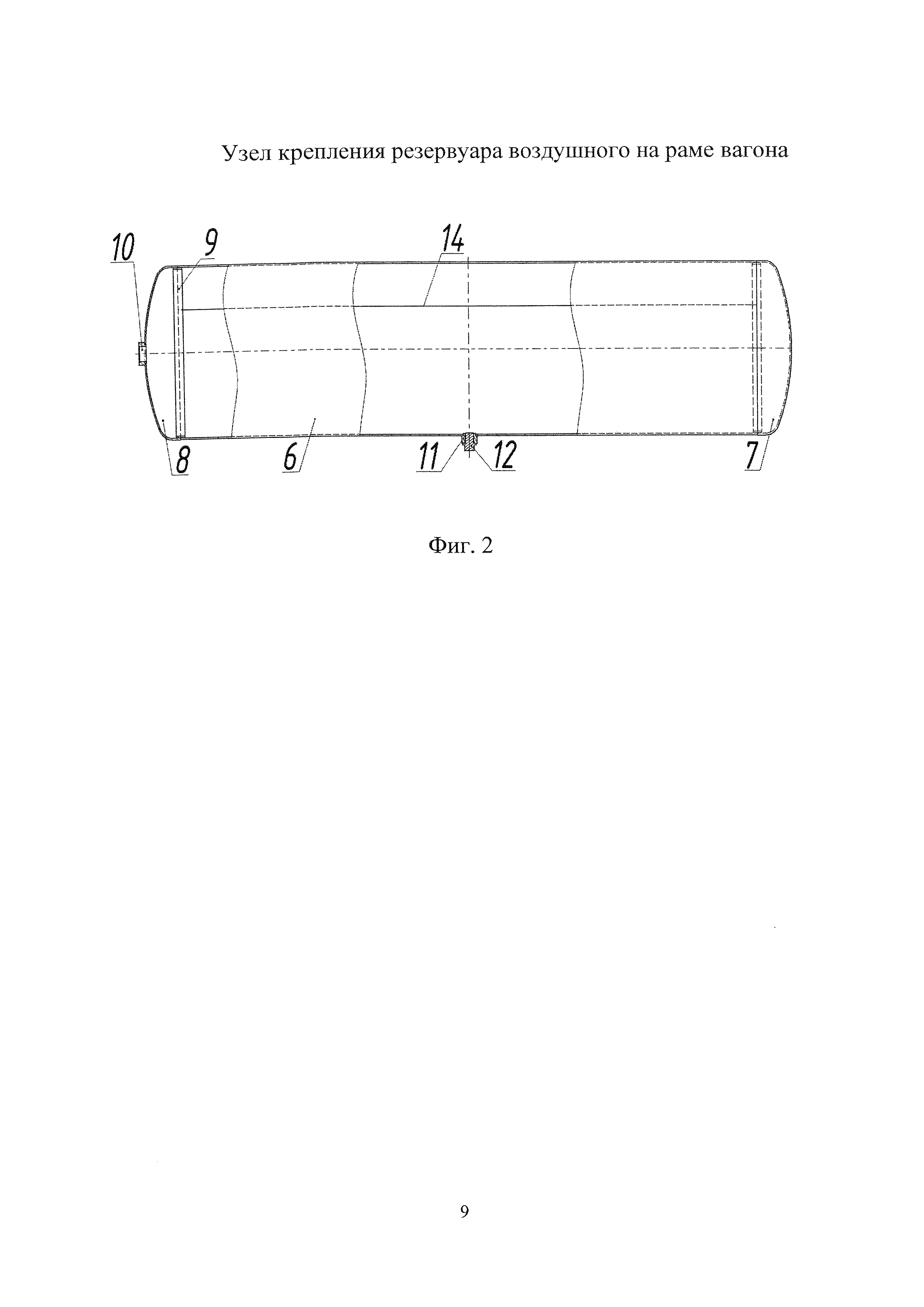 Заявляемая полезная модель относится к железнодорожному транспорту и касается конструкции узла крепления резервуара воздушного на раме вагона.Узел крепления резервуара воздушного на раме вагона содержит раму вагона, ложемент, имеющий скругление в месте перехода вертикальной стенки в опорную дугообразную поверхность, крепежные хомуты, представляющие собой прут в виде дуги, концы которого расположены параллельно друг другу, направлены в одну сторону и имеют резьбу, при этом один конец выполнен прямым а другой имеет радиусный перегиб, крепежные элементы и резервуар воздушный. Резервуар воздушный состоит из обечайки, глухого днища, днища с отверстием, подкладных колец, штуцера днища, штуцера обечайки и пробки. Резервуар воздушный закреплен на ложементе снизу рамы вагона штуцером обечайки вниз. Радиус скруглений ложемента в месте перехода вертикальной стенки в опорную поверхность находится в пределах от 12 до 18 мм. Ширина ложемента составляет не более половины наружного диаметра резервуара воздушного. Расстояние между прямым концом крепежного хомута и ложементом составляет не менее четверти наружного диаметра резервуара воздушного, а продольный сварной шов обечайки резервуара воздушного расположен в промежутке между прямым концом крепежного хомута и ложементом таким образом, что угол «а» в поперечном сечении резервуара воздушного между осью штуцера обечайки резервуара воздушного и серединой продольного сварного шва обечайки резервуара воздушного находится в пределах от 115 до 150°.Заявляемая полезная модель позволяет создать конструкцию узла крепления резервуара воздушного на раме вагона, исключающую возможность повреждения и смятия резервуара воздушного при затяжке крепежных элементов. 5 ил.