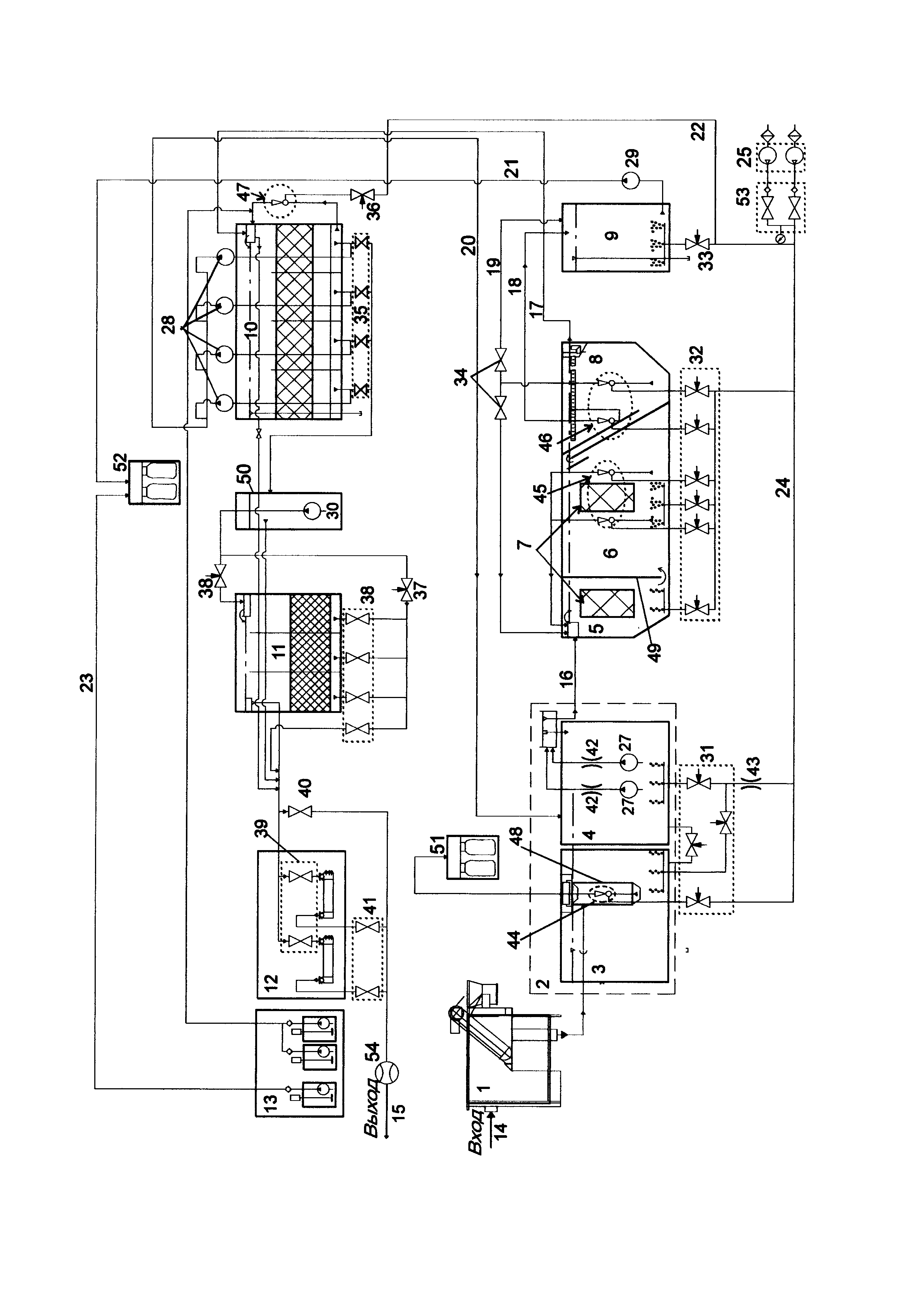 Использование: В установках для очистки хозяйственно-бытовых и близких к ним по составу промышленных сточных вод в аноксидных и аэробных условиях от органических веществ, соединений азота и фосфора.Существо: Установка содержит решетчатый контейнер для сбора и удаления сора и крупнодисперсных примесей, связанный с усреднителем потока воды, денитрификатор, аэротенк с загрузкой и донными эрлифтами, отстойники, биофильтр, биосорбер, обеззараживатель, аэробный стабилизатор, дозаторы реагента, связанные с биофильтром, трубопроводы, насосы, воздуховод с компрессорами, запорные и регулирующие элементы, установленные на трубопроводах, при этом трубопровод подвода стоков соединен через решетчатый контейнер со входом усреднителя потока воды, а трубопровод отвода очищенной воды соединен с выходом обеззараживателя, аэротенк и биофильтр выполнены с обеспечением аэрации от воздуховода посредством упомянутых компрессоров, усреднитель потока воды выполнен двухсекционным, при этом в первой секции упомянутого усреднителя расположена песколовка, а во второй секции расположены насосы для подачи очищаемой жидкости в денитрификатор, а между денитрификатором и аэротенком установлена перегородка с донным перепуском жидкости, аэротенк связан с отстойником, оборудованным донными и поверхностными эрлифтами и соединенным посредством соответствующих трубопроводов с аэробным стабилизатором и биофильтром, оснащенным дополнительно поверхностным эрлифтом, связанным через промежуточную емкость с биосорбером, выход которого соединен с обеззараживателем; биофильтр выполненным секционным, при этом каждая секция биофильтра содержит промывочный насос; на воздуховоде установлен воздушный дроссельный элемент, связанный с усреднителем потока воды. Установка содержит также обезвоживатели осадка, один из которых связан с песколовкой, а другой - с аэробным стабилизатором.Технический результат заключается в повышении эффективности очистки сточных вод. 1 ил.