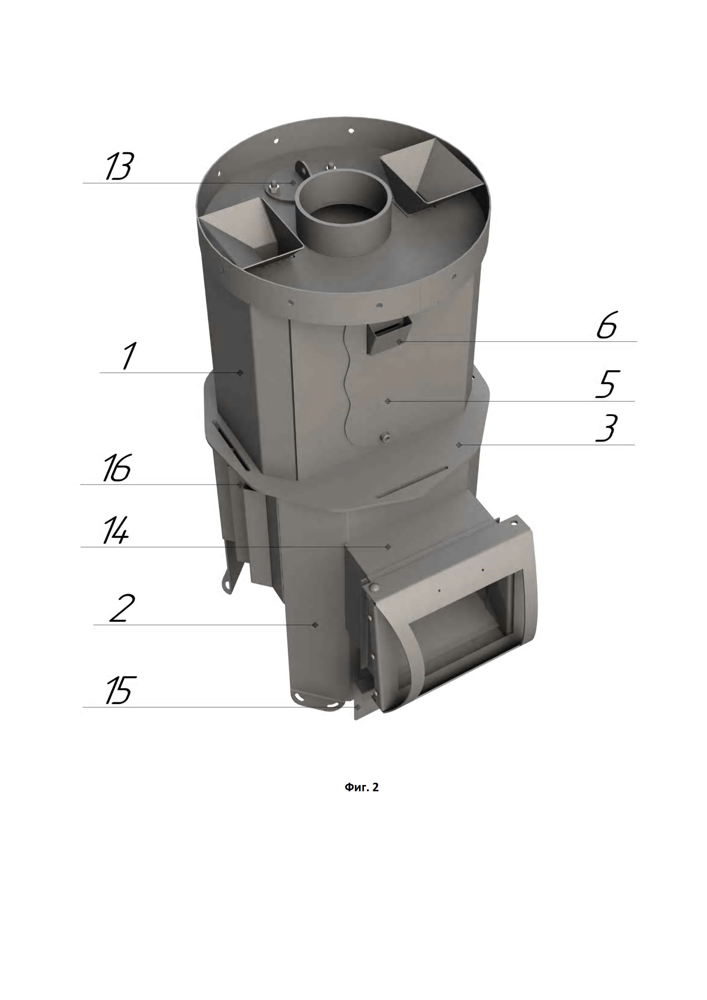 Нижний корпус устройства с опорными ногами служит топкой и имеет топочный канал с дверцей, зольный ящик и металлические радиаторы с трех других его сторон, не доходящие вплотную к нижней плите верхнего корпуса.