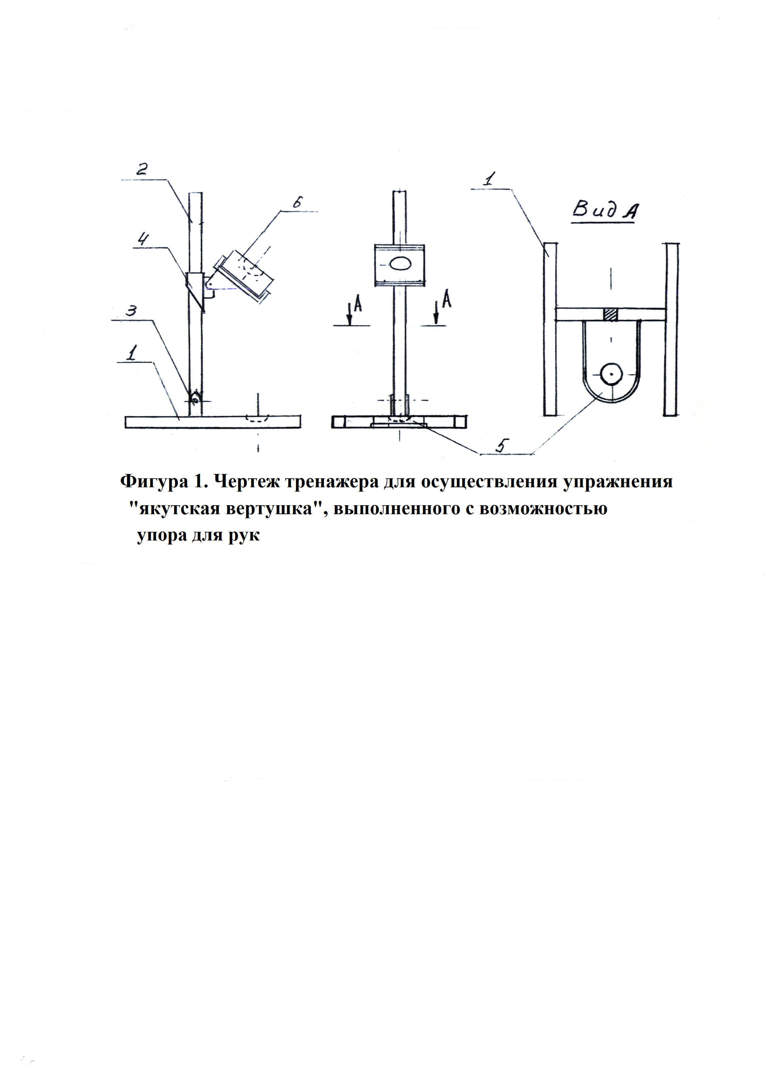 1. Тренажер для осуществления упражнения якутская вертушка, выполненный с возможностью удержания упора для рук, состоящий из опорной части, в основании которой прикрепляется нижняя деревянная опора с углублением и вертикальная часть, изменяющая угол наклона, вдоль которой, с регулировкой высоты, перемещается верхняя деревянная опора с углублением. 2. Тренажер для осуществления упражнения якутская вертушка, выполненный с возможностью удержания упора для рук по п. 1, характеризующийся тем, что верхняя деревянная опора, перемещаемая вдоль вертикальной части, может регулироваться по углу наклона. 3. Тренажер для осуществления упражнения якутская вертушка, выполненный с возможностью удержания упора для рук по п. 1, характеризующийся тем, что резьбовые элементы между опорной частью и вертикальной, а также между вертикальной частью и верхней деревянной опорой позволяют трансформировать конструкцию из объемной формы в плоскую.