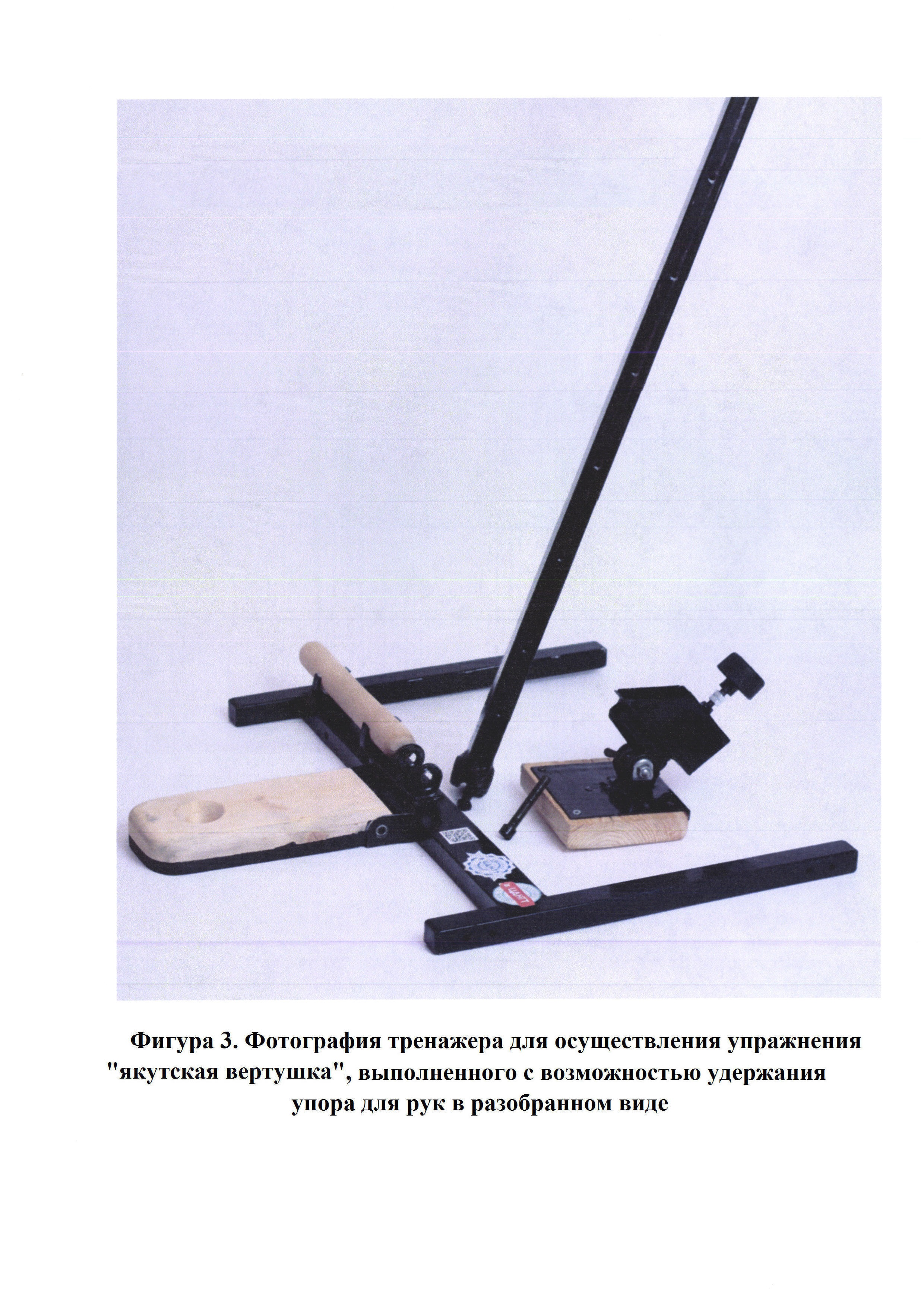 Полезная модель относится к устройствам для физических занятий на спортивных и оздоровительных тренажерах, которая позволяет в полном соответствии с правилами игры реализовать двигательные действия и отразить смысловое содержание традиционной якутской силовой игры «якутская вертушка». Изобретение относится к сфере технического сопровождения спортивно-оздоровительных занятий, имеющих направленность для здоровья, физического воспитания, спорта и может быть использовано как средство и метод воспитания базовых и специальных физических двигательных качеств в отдельных видах спорта. В результате проведенного информационного поиска возможных существующих патентных изобретений, которые можно отнести к близким аналогам нашей предполагаемой полезной модели показал такие данные. Известен продукт, представляющий собой два предмета - деревянную палку и деревянную поверхность с полусферическим углублением, который используется в традиционной национальной якутской игре «якутская вертушка» («тутум эргиир»). Из техники известно устройство, предполагаемое к использованию непосредственно для игры «якутская вертушка» [Устройство тренажер для занятий по "якутской вертушке" (Патент РФ на ПМ 177376)], с использованием целостной конструкции в результате шарнирного соединения палки упора и упорной доски. Основной задачей такого конструкторского решения является создание специального снаряда «вертушки», позволяющего снять трудности при тренировочных занятиях, обусловленные, главным образом, удерживанием палки на месте. Также, в этом устройстве, для достижения поставленной цели, упорная палка имеет фигурную форму, облегчающую опорное положение кистей рук. За счет такой формы происходит значительное (частичное) перераспределение усилий, необходимое для предотвращения скольжения палки в ладонях руки на опорное усилие в кистях рук. Основными недостатками этого устройства является: 1 - возможность использования этого устройства только людьми, имеющим спортивную подготовку на достаточно высоком уровне, т.к. заявленное снятие трудностей при выполнении упражнения не решается только фиксированием палки на месте. 2 - не снимается высокая степень трудности при выполнении двигательного действия только за счет удержания палки на месте, т.к. общая величина нагрузки, испытуемая организмом при выполнении упражнения, регулируется в первую очередь высотой точки опоры от горизонтальной поверхности пола. Общая конструкция тела и устройства предполагает равномерное распределение массы тела в точках опоры - удержания палки руками и ног на поверхность пола, при условии нахождения их на одном горизонтальном уровне. При изменении горизонтального уровня между точками опоры будет происходить перераспределение массы тела и соответственно изменение величины нагрузки в этих местах. Поэтому, только поднимая точку опоры в месте удержания палки кистями рук, можно уменьшить давление в этом соединении, оказываемое массой собственного тела, и тем самым уменьшить величину реакции опоры. Учет фактора высоты точки опоры для палки упора от поверхности пола позволяет эффективно регулировать трудность выполнения упражнения. 3 - отсутствие мобильности в возможности перемещения устройства, т.к. конструкцией предусмотрена необходимость жесткого кр