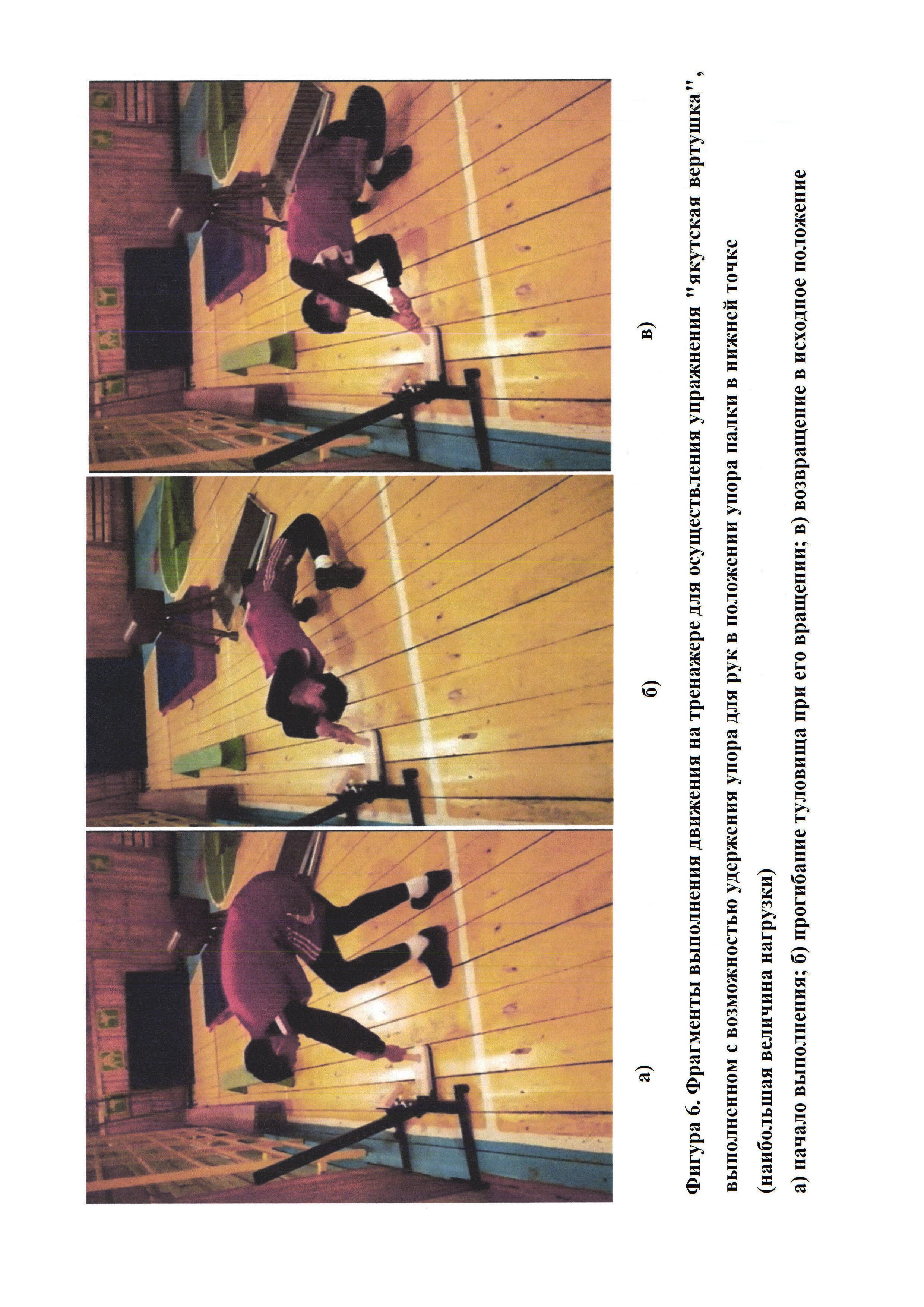 Полезная модель относится к устройствам спортивным и оздоровительным тренажерам, которые позволяют в полном соответствии с правилами реализовать двигательные действия и отразить смысловое содержание традиционной национальной якутской силовой игры «якутская вертушка» («тутум эргиир»). Тренажер для осуществления упражнения «якутская вертушка», выполненный с возможностью удержания упора для рук, состоящий из опорной части, в основании которой прикрепляется нижняя деревянная опора с углублением и вертикальная часть, изменяющая угол наклона, вдоль которой, с регулировкой высоты, перемещается верхняя деревянная опора с углублением. Отличается малой стоимостью, мобильностью, безопасностью, надежностью, регулированием величины нагрузки в двигательном действии. 2 з.п. ф-лы, 6 ил.