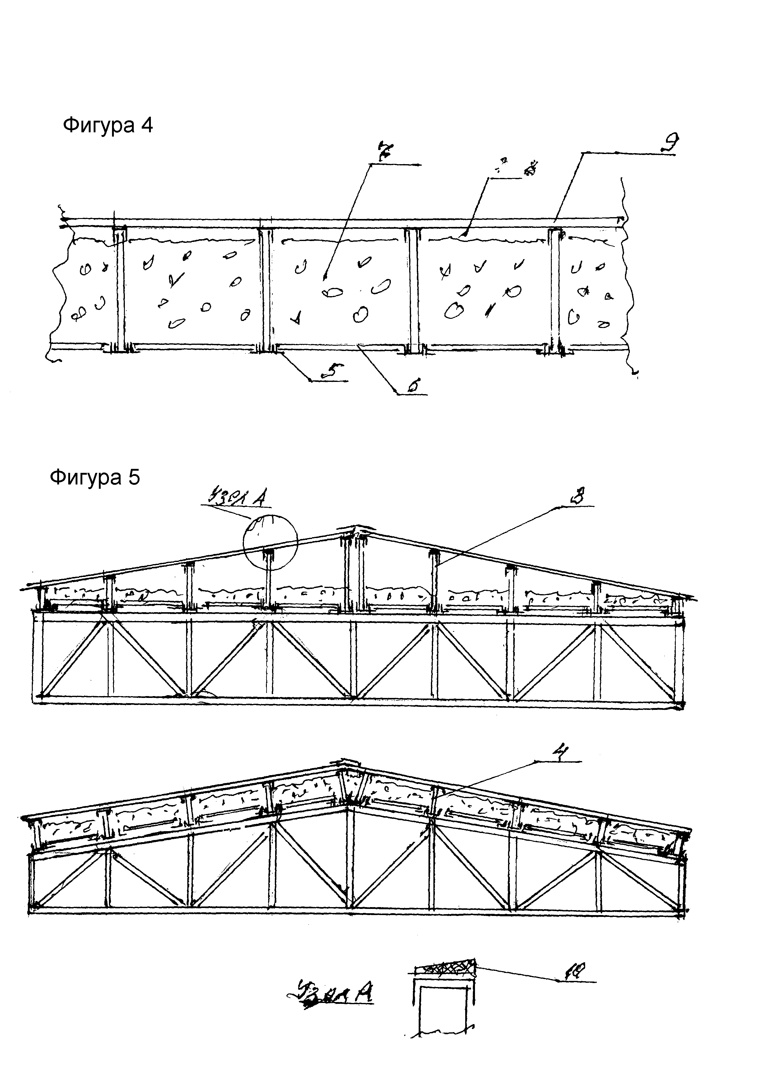 По верхнему поясу ферм (балок) укладываются решетчатые фермы из легких стальных конструкций (ЛСТК), в нижнем поясе которых крепится оцинкованный опорный уголок, служащий для увеличения опорной базы ферм и опорной поверхности для нижнего слоя оцинкованного профилированного листа, несущего только вес утеплителя. Крепление нижнего профлиста осуществляется самонарезными винтами через стеклоткань, пропитанную эпоксидной смолой. На нижний профлист укладывается утеплитель - полистиролбетон объемным весом до 200 кг/м3, служащий одновременно пароизоляцией. Верхний оцинкованный профилированный настил, укладываемый пояс по верхнему поясу решетчатых прогонов несущий проектные нагрузки (снег, ветер, собственный вес) и закрепляемый самонарезными винтами в соответствии с требованиями СП. Уровень техники Рассматривая в качестве аналога патент №РП 2422597, в котором используются решетчатые прогоны с применением одиночных уголков и, обеспечивая конструктивную жесткость доборными стержнями, установлено отсутствие использования пространства решетчатых прогонов для утеплителя. Отличием предлагаемой полезной модели является обеспечение жесткости установкой профилированного настила по нижнему и верхнему поясам решетчатых прогонов. Технический результат предлагаемой полезной модели - обеспечение жесткости каркаса из решетчатых прогонов, устанавливаемых на верхние пояса стальных ферм. Задача технического результата при использовании. Устройство утепленной кровли с применением долговечного утеплителя, оцинкованных решетчатых прогонов и наличием вентилируемого пространства между утеплителем и верхним профилированным листом. Характеристика полезной модели Предлагаемая полезная модель устройства кровли из оцинкованного профилированного настила по решетчатым прогонам из ЛСТК с утеплением полистиролбетоном объемным весом до 200 кг/м3, укладываемым на нижний опорный оцинкованный профилированный настил состоит из: решетчатых прогонов одинаковой высоты для несущих ферм с наклонным верхним поясом и разной высоты для несущих ферм с параллельными поясами; опорного уголка, прикрепляемого к нижнему поясу решетчатого прогона, служащего опорной базой для крепления к ферме с плоскостью для укладки нижнего оцинкованного профилированного листа; нижний оцинкованный профлист, укладываемый в пролете между прогонами, несущий нагрузку от утеплителя из полистиролбетона объемным весом до 200 кг/м3; верхний оцинкованный профлист, укладываемый по верхнему поясу решетчатых прогонов, несущий проектные нагрузки; крепление нижнего оцинкованного профилированного листа возможно самонарезными винтами или через стеклоткань, пропитанную эпоксидной смолой; крепление верхнего оцинкованного листа выполняется самонарезными винтами в соответствии с требованиями СП; создание вентилируемого пространства между утеплителем и верхним профилированным листом и, соответственно, улучшение условий эксплуатации. Осуществление полезной модели Использование предлагаемой полезной модели возможно при строительстве большепролетных промышленных зданий с покрытием из металлоконструкций в любом регионе РФ. Чертежи Рисунок 1: на фиг. 1 изображены фермы покрытия с параллельными поясами (поз.1) и наклонным верхним поясом (поз.2); на фиг. 2 - изображены решетча