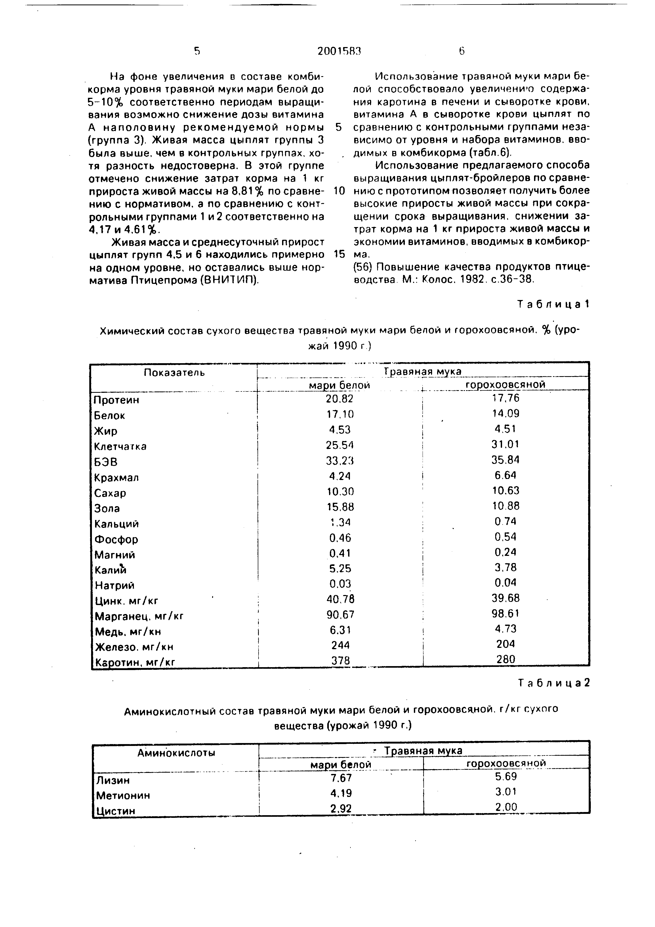 витамина А нн 1 /2 рекомендуемой нормы . Травяная мука мари белой новое кормовое