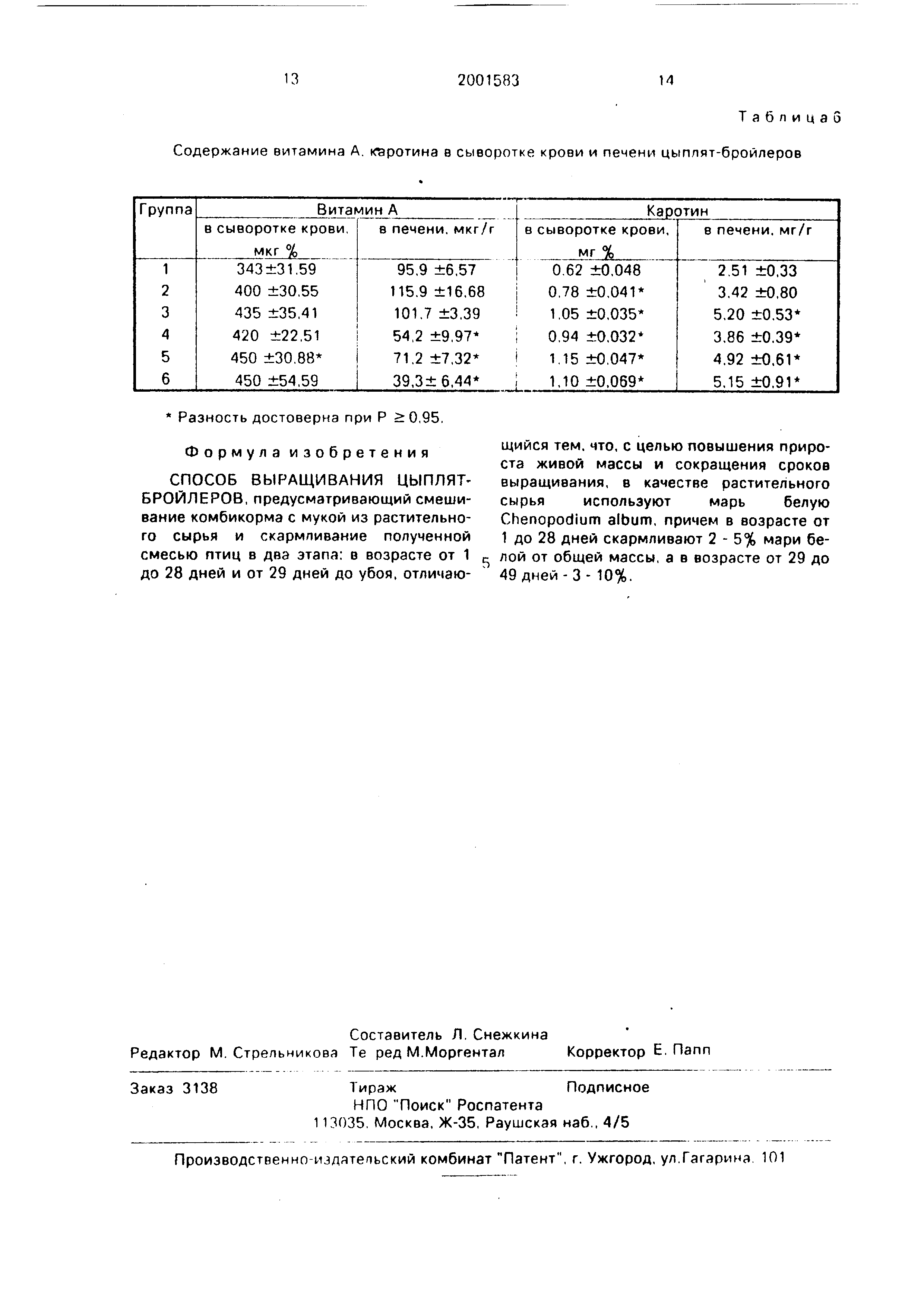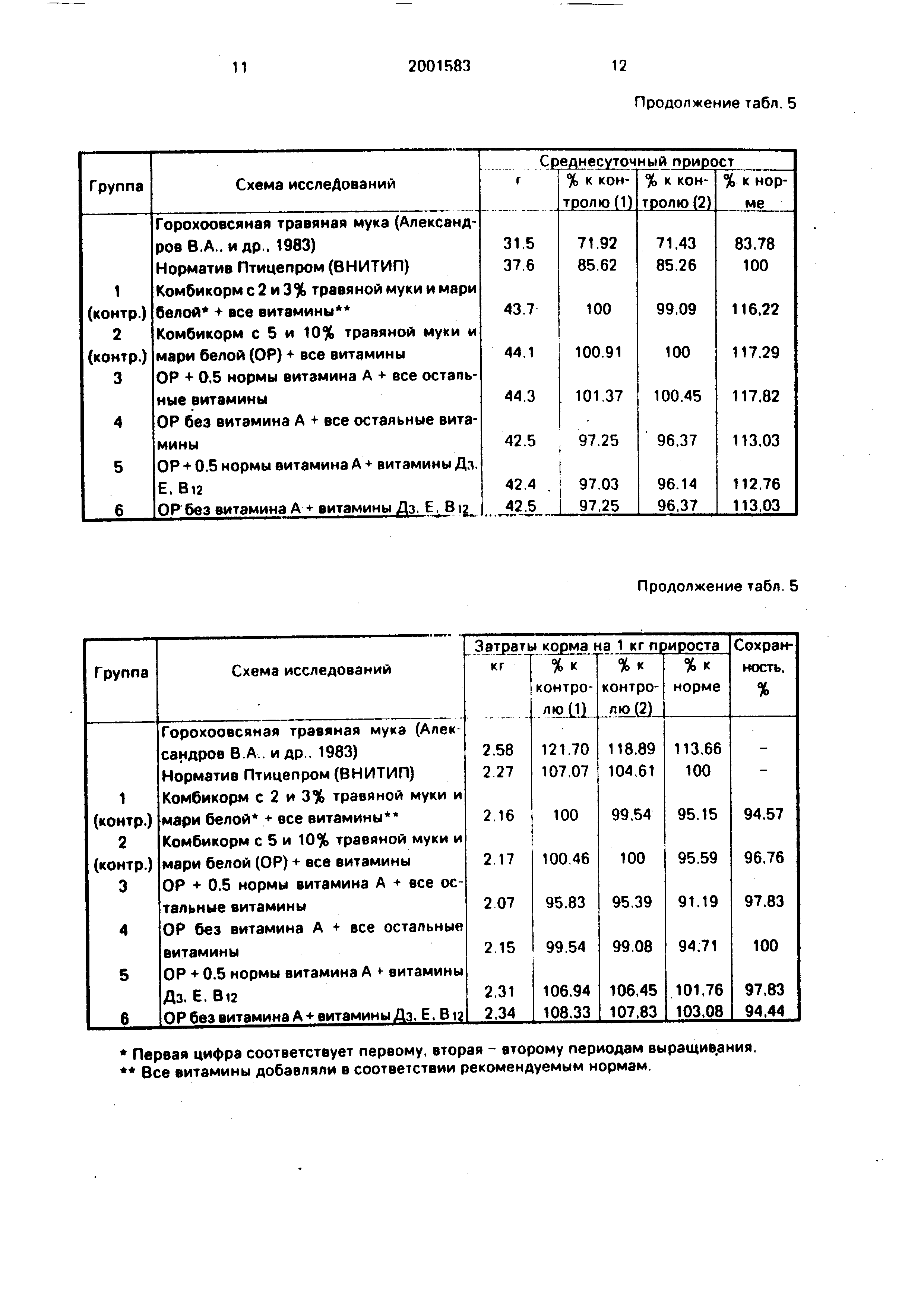 Недостающее до нормы количество метионина восполняли за счет кормового препарата. Продолжение табл 4 Таблица 5 Результаты опыта Первая цифра соответствует первому, вторая - второму периодам выращив.ания. Все витамины добавляли в соответствии рекомендуемым нормам. Продолжение табл. 5 Продолжение табл, 5 13200158314 Таблицао