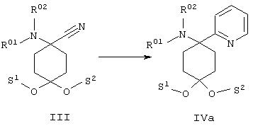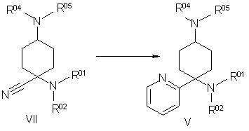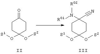 группу и при необходимости проводят ацилирование, алкилирование или сульфирование, б) производное 4-аминоциклогексанона формулы VI подвергают в присутствии соединения формулы HNR01R02 взаимодействию с цианидом, предпочтительно цианидом калия, с получением производного циклогексаноннитрила формулы VII после чего при необходимости в любой последовательности и при необходимости неоднократно проводят ацилирование, алкилирование или