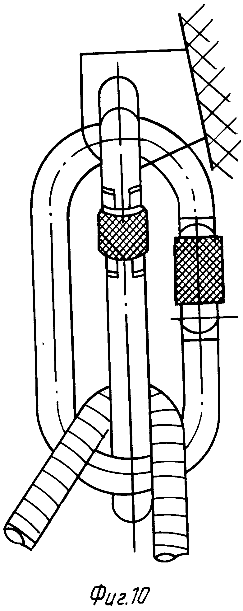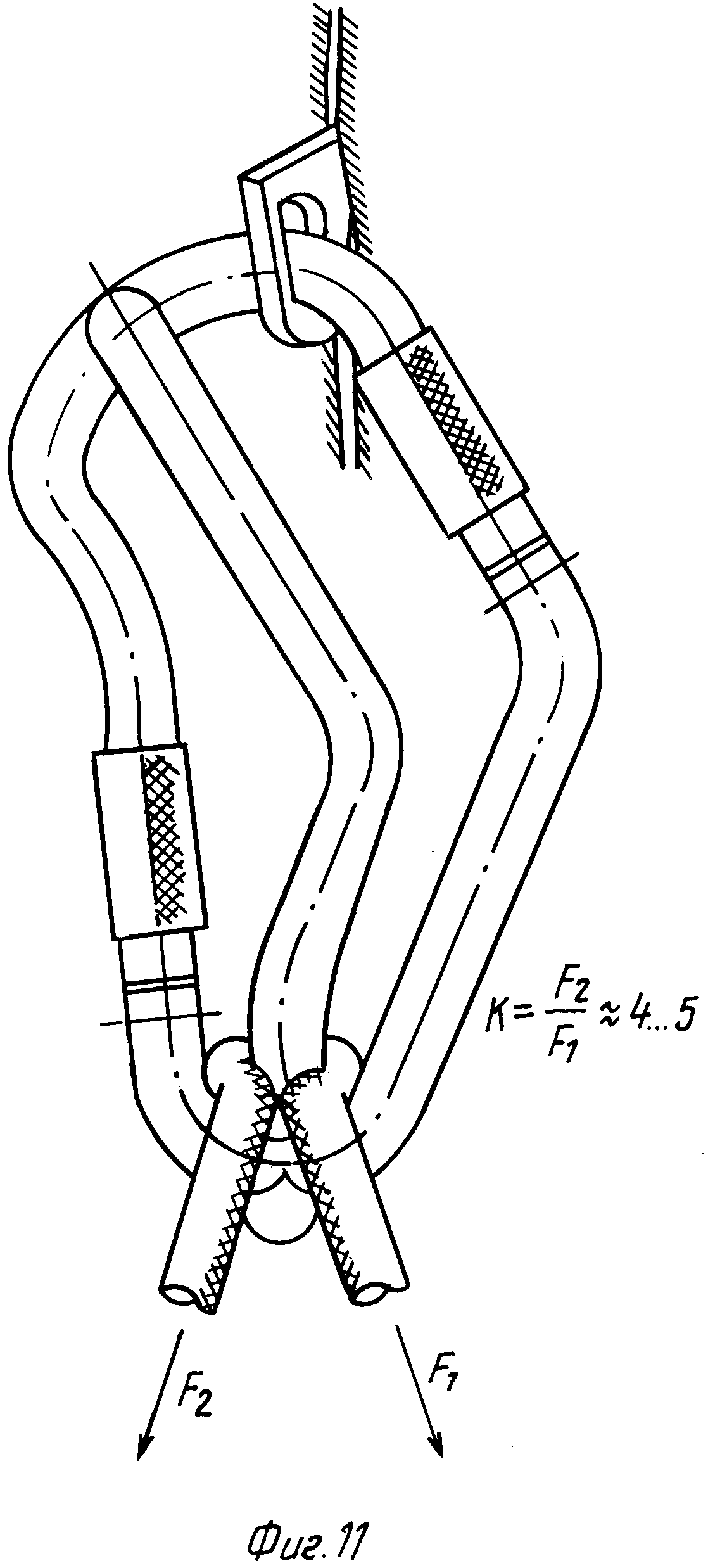 (фиг. 7) можно получить два варианта страховки. В первом случае страховочный трос 12, соскользнув вниз, зажимается как показано на фиг. 10 и 11 несколькими
