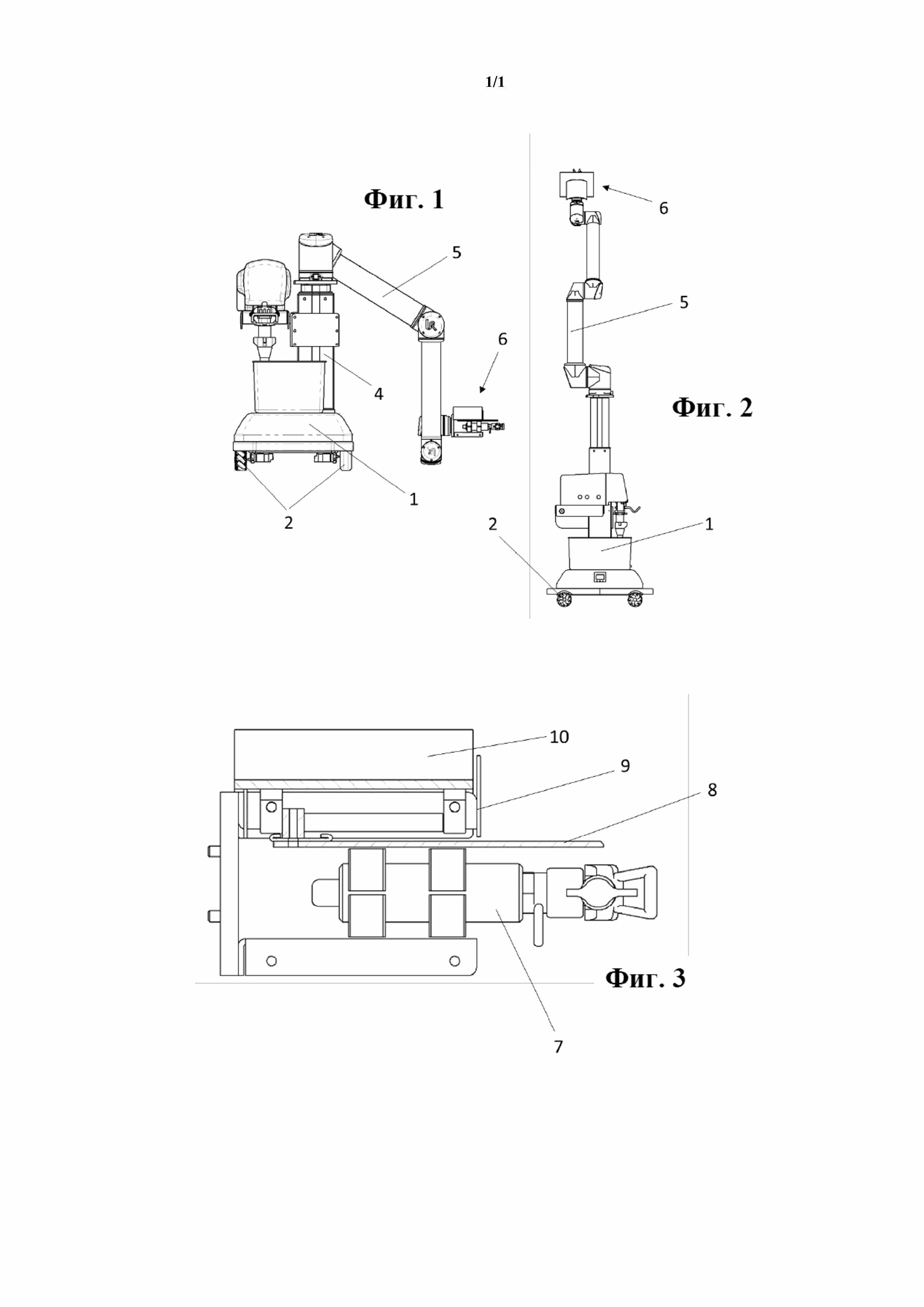 Настоящая полезная модель относится к автономному роботу для покраски внутренней части домов, коммерческих помещений, гостиниц и т. д. Этот робот представляет собой устройство, выполненное с возможностью покраски и обрисовки при распознавании препятствий в рабочей зоне, направленное на уменьшение усилий и времени, необходимых для выполнения этих операций. Данное устройство применимо в области дизайна интерьера и завершения небольших работ по отделке. УРОВЕНЬ ТЕХНИКИ Несмотря на последние технологические достижения в области строительства и улучшения в области технического обслуживания, вопрос покраски и реставрации внутренней части помещения остается весьма кустарным. Следовательно, это медленный и дорогостоящий процесс, особенно когда речь идет о больших внутренних поверхностях, которые нужно покрасить, таких как: салоны, большие поверхности, гостиницы и т. д. Объектом настоящей полезной модели является устройство для покраски, обрисовки и распознавания препятствий в рабочей зоне, направленное на уменьшение усилий и времени, необходимых для выполнения этих операций. Следовательно, персонал, отвечающий за реставрацию объектов на больших площадях, должен приложить значительные усилия для покраски высоких потолков и труднодоступных углов. Кроме того, положения, необходимые для достижения потолков или углов, часто бывают неправильными или труднодоступными и должны покрываться краской в несколько этапов из соображений гигиены труда. Заявителю не известны другие устройства, подобные устройству согласно настоящей полезной модели. КРАТКОЕ ОПИСАНИЕ СУЩНОСТИ Настоящая полезная модель относится к автономному роботу для покраски согласно формуле полезной модели, варианты осуществления которого решают проблемы предшествующего уровня техники. Основание в сборе руки робота представляет собой автономное устройство, которое позволяет покрасить все поверхности от минимального уровня – от уровня земли до потолка, что может составлять 3 метра и более, в зависимости от размеров помещения. Автономный робот для покраски состоит из подвижного основания с баком для краски и насосом или компрессором. Основание содержит ряд датчиков, выполненных с возможностью определения местоположения и обнаружения препятствий. По существу вертикальная подъемная колонна отходит от основания, на конце которого расположена сочлененная рука робота, увенчанная головкой. Эта головка содержит пистолет с краской, подключенный к насосу, например, пистолет «безвоздушного» типа, одну или более камер и датчик приближения. Предпочтительно, она также содержит выдвижной шпатель. В предпочтительном варианте осуществления основание содержит всенаправленные колеса. Каждая из камер головки может содержать источники света. Другие варианты будут описаны далее. ОПИСАНИЕ ЧЕРТЕЖЕЙ Для лучшего понимания настоящей полезной модели включены следующие фигуры. На фиг. 1 представлен вид спереди варианта осуществления устройства со сложенной рукой робота. На фиг. 2 представлен вид сбоку предыдущего иллюстративного варианта осуществления с развернутой рукой робота. На фиг. 3 представлена деталь примера головки. ВАРИАНТЫ ОСУЩЕСТВЛЕНИЯ ПОЛЕЗНОЙ МОДЕЛИ Далее будет кратко описан вариант осуществления настоящей полезной модели в качестве ее иллюстративн