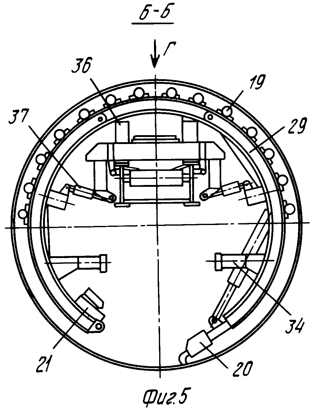 фиг. 5 - сечение Б-Б на фиг.1; на фиг.6 - сечение В-В на фиг.2; на фиг.7 - вид по стрелке Г на фиг.5. Механизированный щитовой комплекс