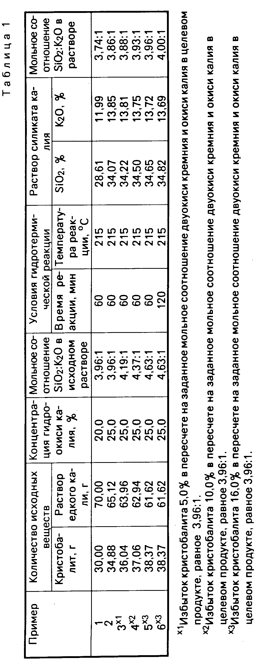 достижения повышенного мольного соотношения двуокиси кремния и окиси калия в реакционном растворе по сравнению с примером 1 используют повышающийся избыток (+5,10 и 16%) кристобалита в пересчете на