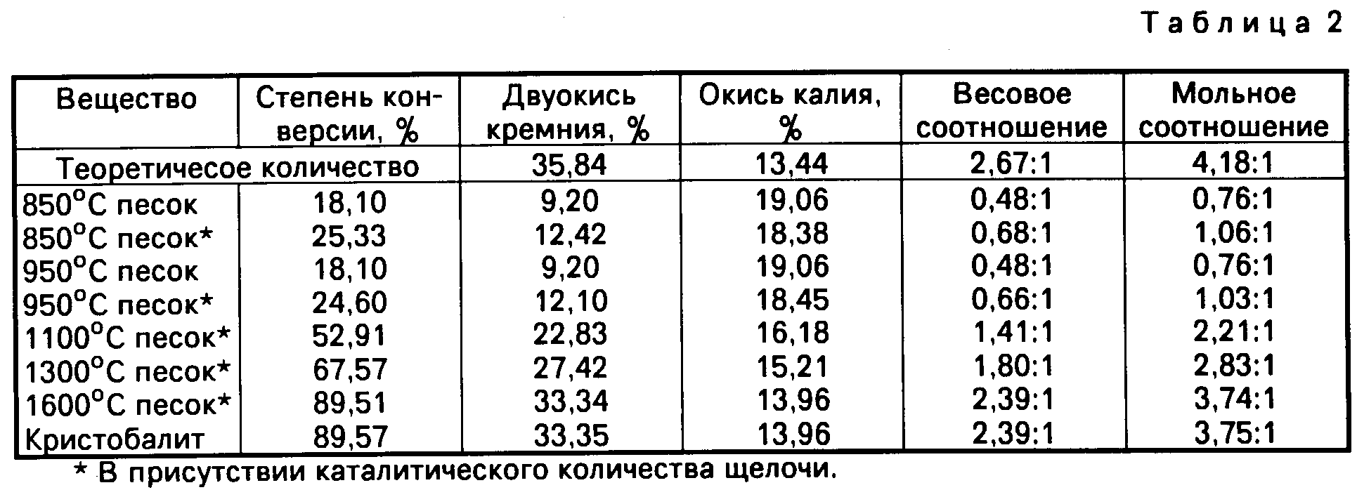 калия с концентрацией 10-40 мас.%. Предпочтительно в качестве кристаллической двуокиси кремния используют кварц, прошедший предварительный обжиг при температуре 1200-1700оС,