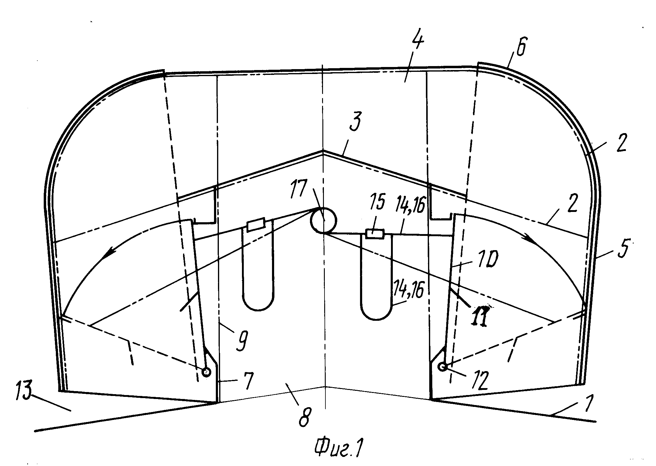 стенки 4, боковые ветрозащитные панели 5 с закругленной верхней частью 6, продольные стенки 7, ограничивающие шахту 8 с проемами 9. Проемы 9 закрыты заслонками 10 с отбойниками 11, поворачивающимися