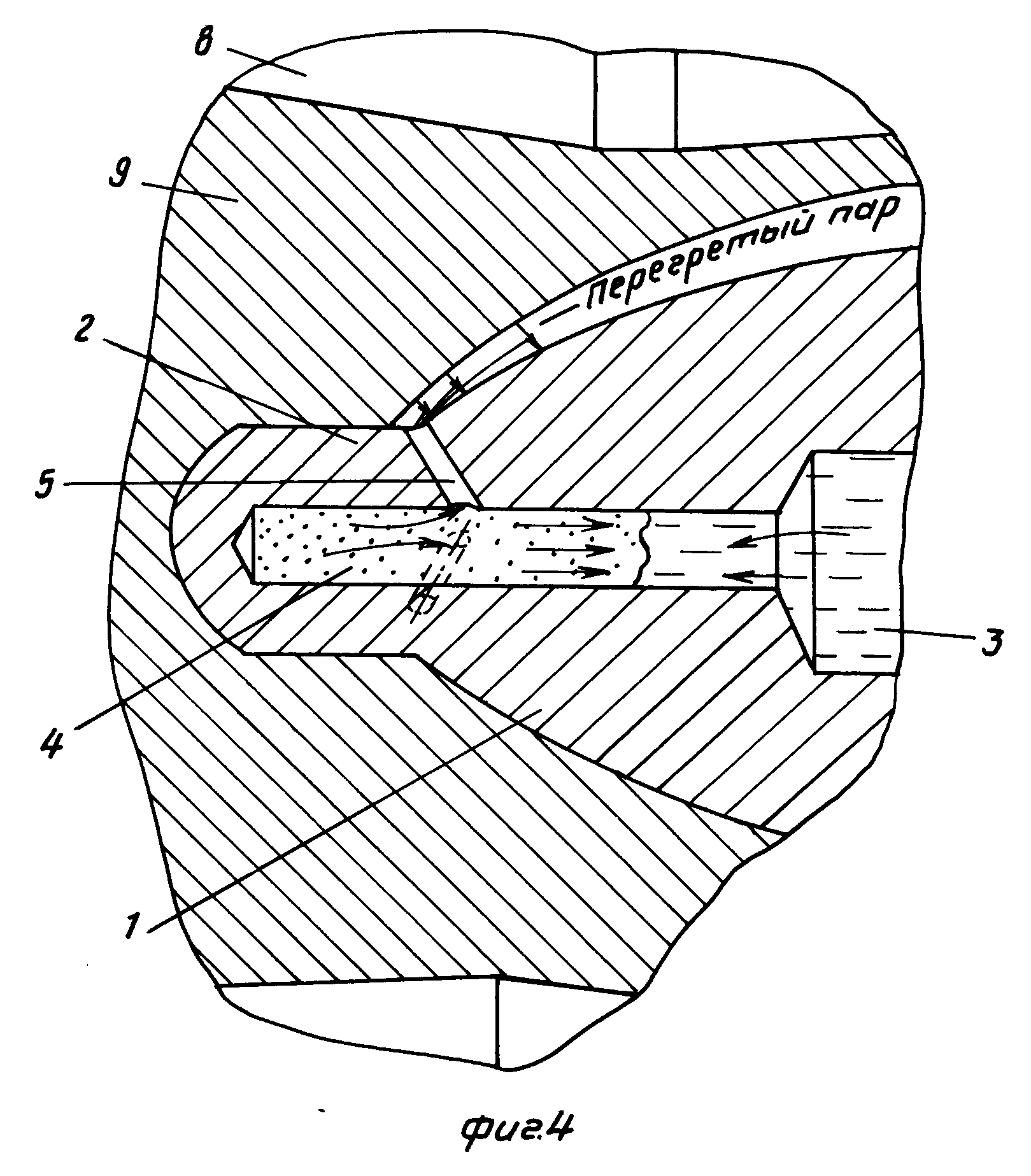 В дальнейшем в процессе прошивки носовой участок оправки разогревается до 700-1000оС, и охлаждающая жидкость в замкнутом донном участке полости превращается в пар, причем увеличение объема и давления пара происходят настолько интенсивно, что охлаждающая жидкость вытесняется не только из донного участка полости, но также из смежных с ним участков. При этом в каналы вместо охлаждающей жидкости с большой скоростью и давлением поступает перегретый пар. Это визуально проявляется в том, что при прошивке второй половины заготовки из переднего конца гильзы с большой скоростью и шумом выходит пар. С этого момента оправки перестает работать как водоохлаждаемая, т. к. теплопроводность пара, как газа, намного меньше теплопроводности охлаждающей жидкости. Второй негативный фактор данного явления состоит в том, что перегретый пар, являясь сильнейшим окислителем, дополнительно разогревает рабочую поверхность оправки и способствует ее интенсивному локальному износу.