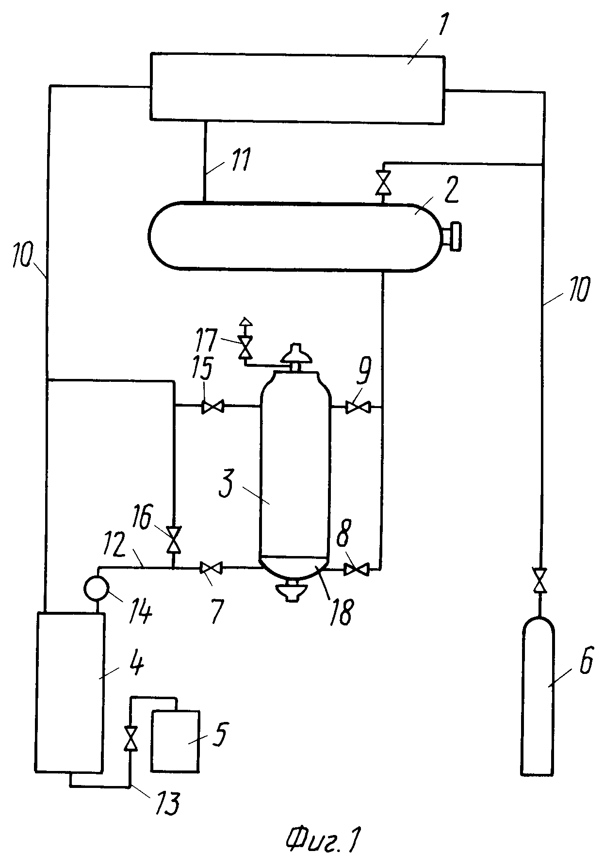 поступает газообразный диоксид углерода по трубопроводу 10 в конденсатор 1, а из него жидкий диоксид углерода по трубопроводу 11