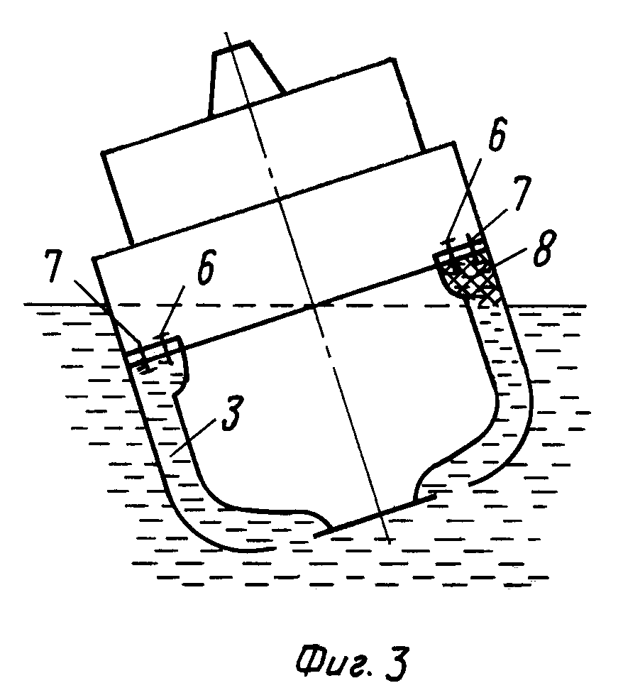 судна содержит бортовые цистерны, состоящие из горизонтальных емкостей 1, установленных на уровне ватерлинии 2, и вертикальных каналов 3 прямоугольного сечения, сообщающихся с