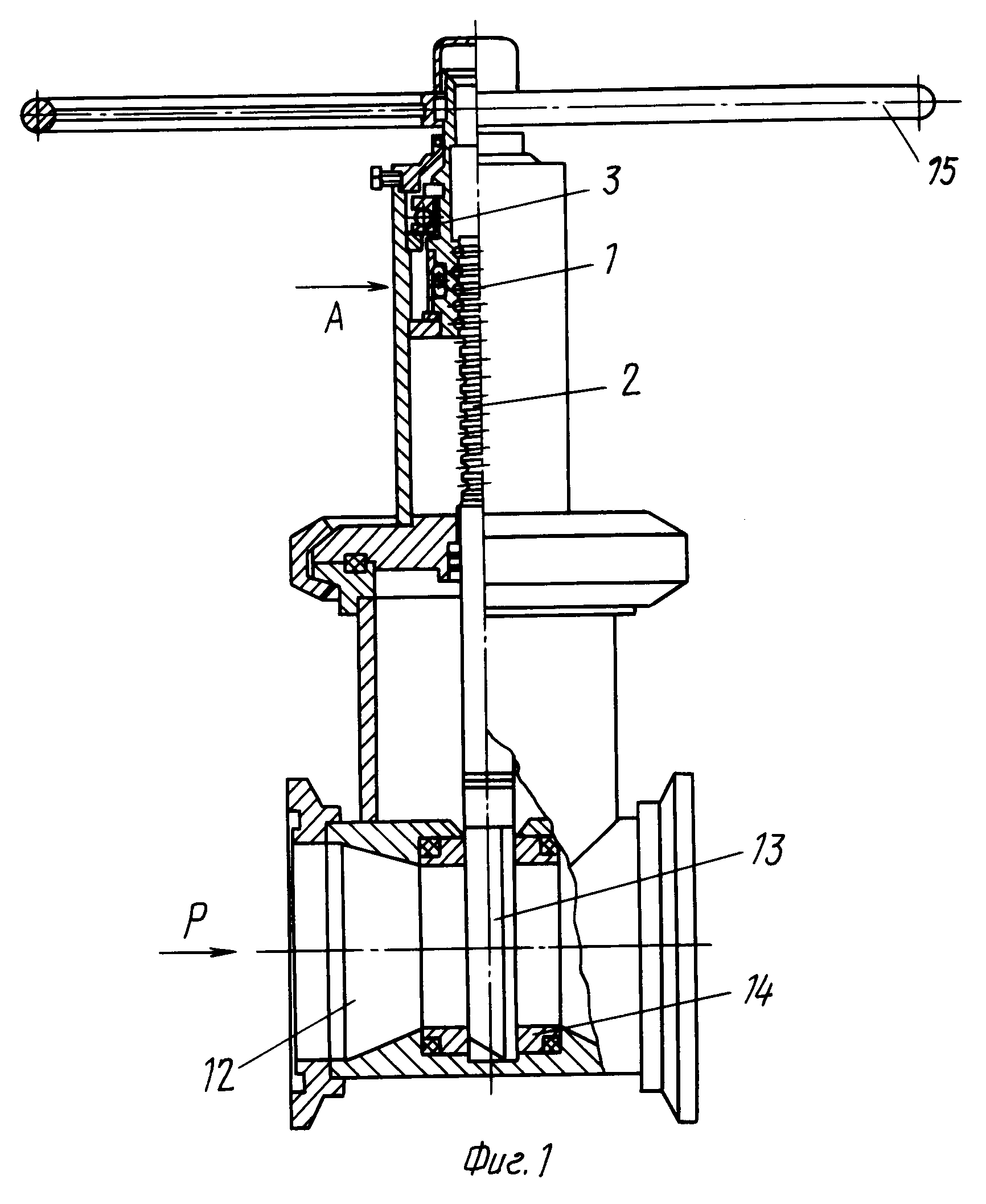 При вращении штурвала 15 на открытие задвижки, жестко соединенного с гайкой 3, усилия передаются через шарики 4 на винт 2, который сочленен с шибером 13 шпунтовым способом и не вращается. Винт 2