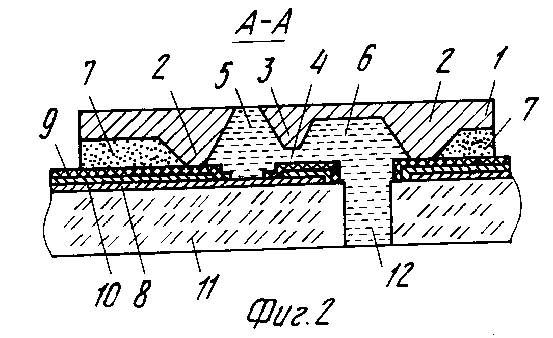тонкостенной перегородки 2 и ребер жесткости 13. Подвод тока через подложку кремния позволяет сформировать участки любой конфигурации с равной высотой. Далее на подложку