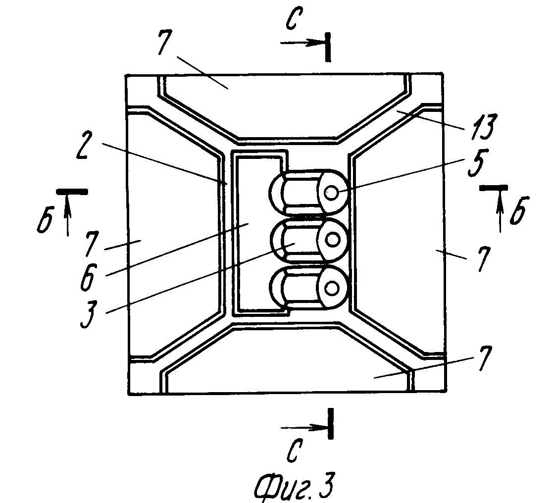 на фиг. 3 пластина с соплами с внутренней поверхности; на фиг. 4 разрез Б-Б на фиг. 3; на фиг. 5 разрез С-С на фиг. 3. Головка содержит пластину с соплами 1, на которой