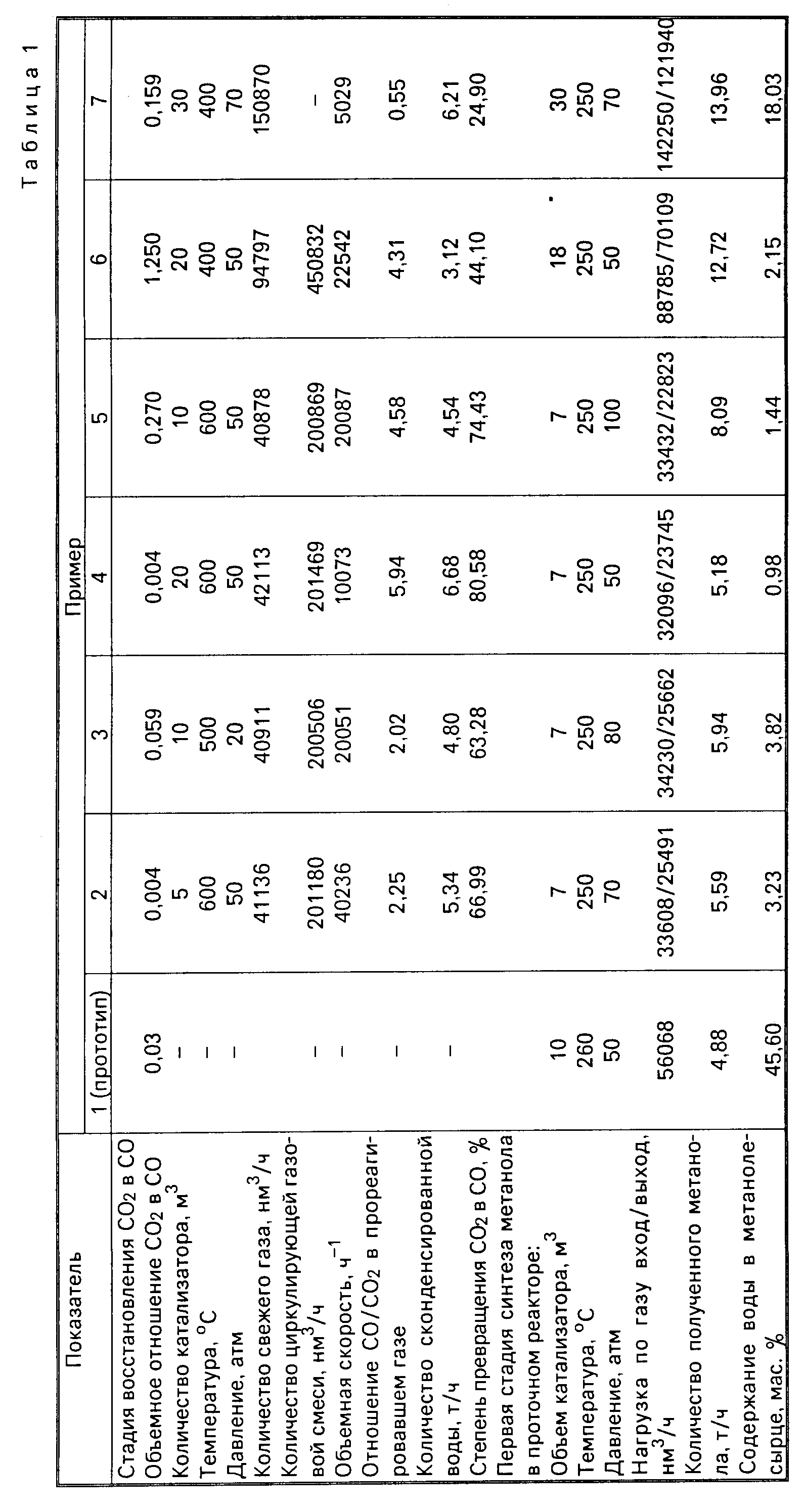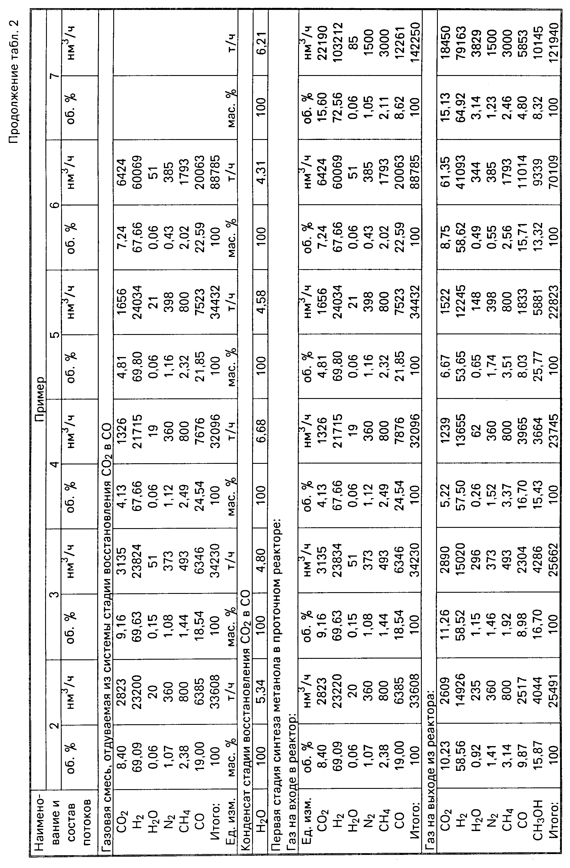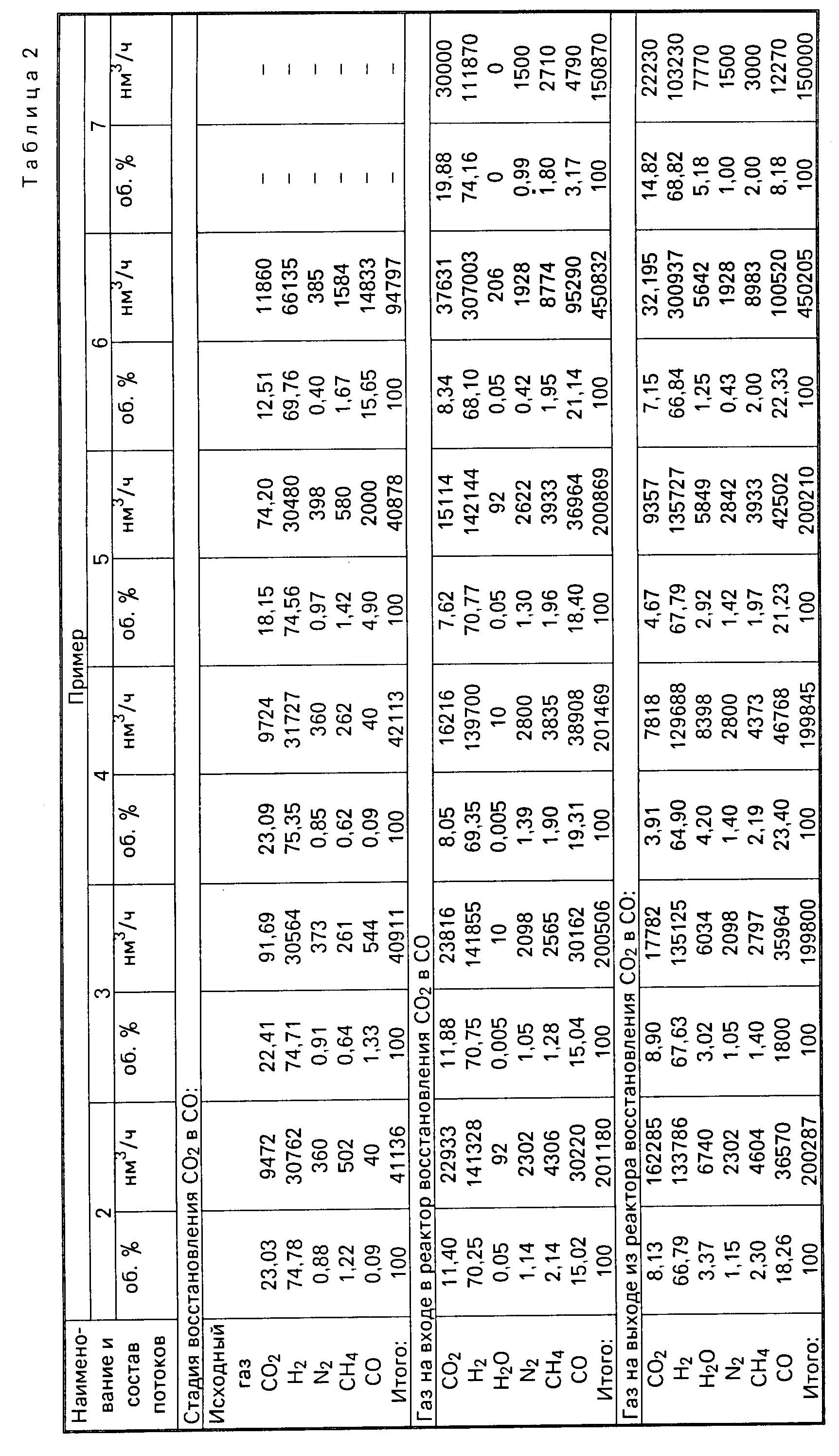 В примерах 2-6 предварительное восстановление СО2 в СО проводят в реакторе с рециклом, а в примере 7 в проточном реакторе. Условия и результаты синтеза метанола по примерам 1-7 сведены в табл.1, а в табл.2 даны материальные потоки, соответствующие примерам 2-7.