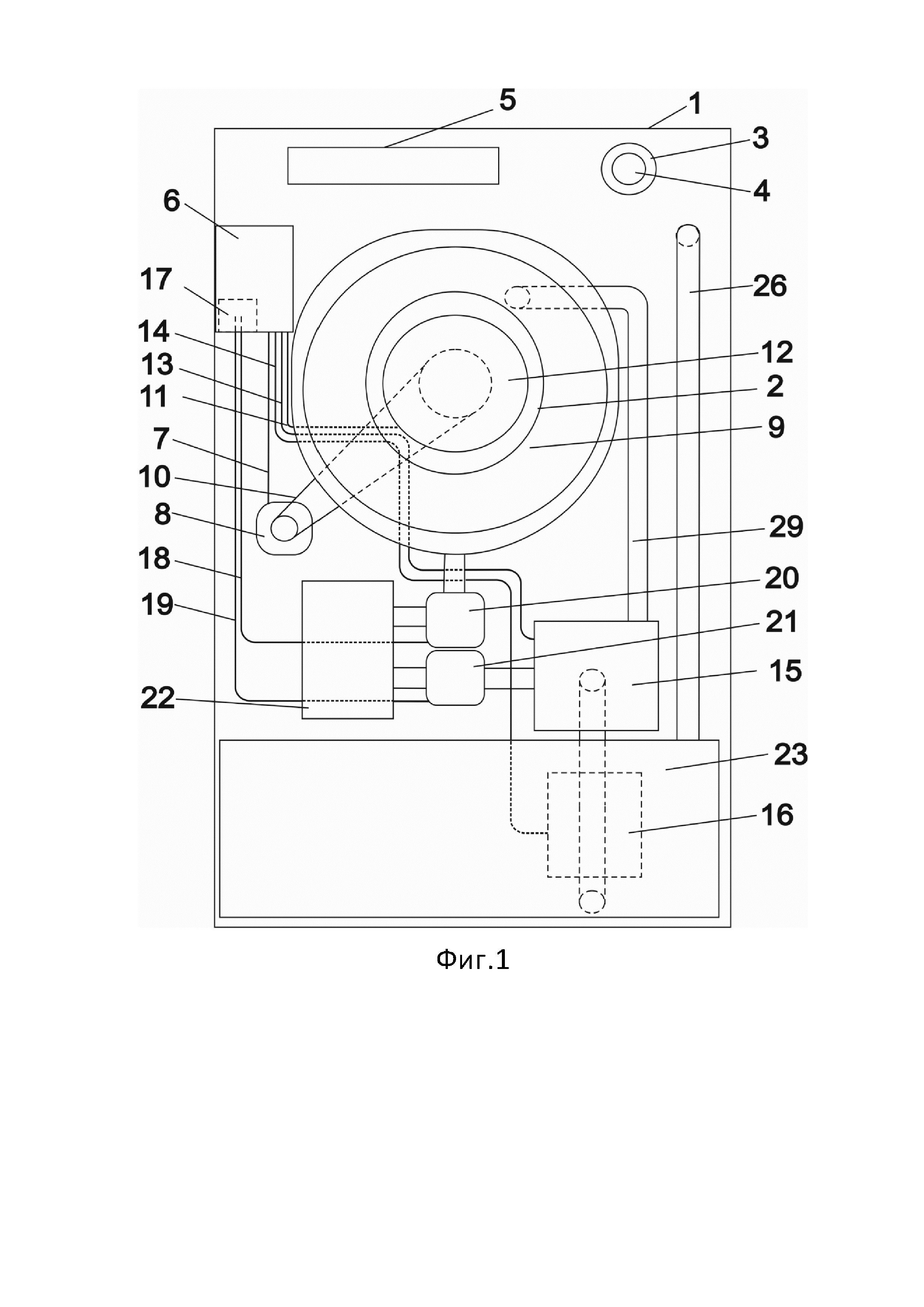 3 – ручка выбора режима стирки, 4 – кнопка пуска, 5 – панель отображения состояния работы, 6 – блок питания с управляющей автоматикой, 7 – первый проводной кабель, 8 – электродвигатель, 9 – камера для стирки, 10 – ременная передача, 11 – второй проводной кабель, 12 – генератор ультразвука, 13 – третий проводной кабель,