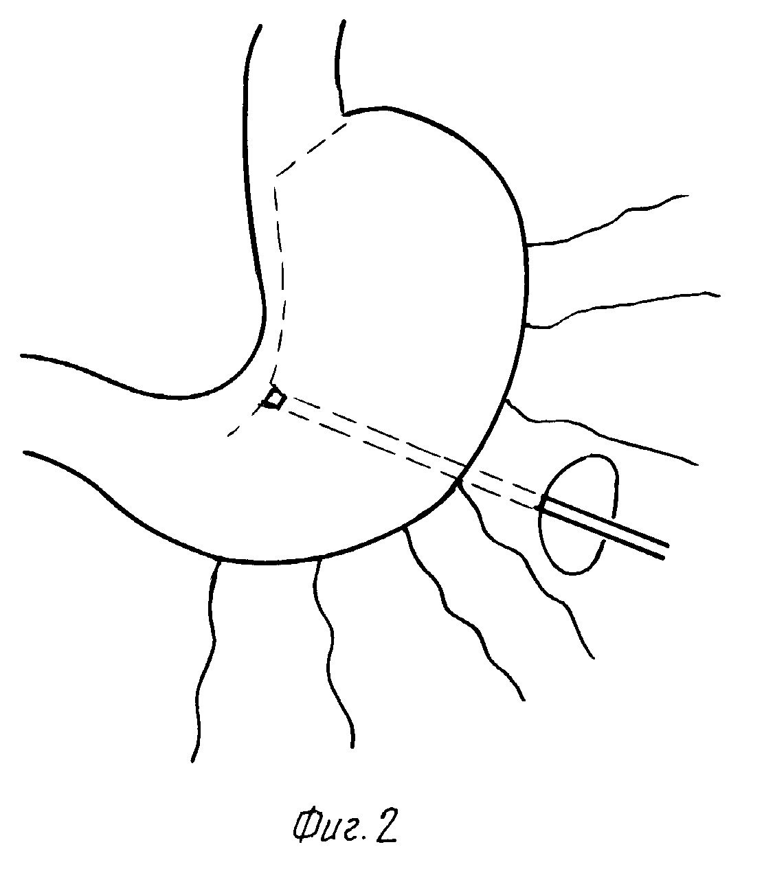 Криодеструкция осуществляется при помощи специальных криодеструкторов как импортного, так и отечественного производства, имеющих специальные профилированные насадки, являющиеся рабочей частью криодеструктора. Температура насадки в рабочем режиме -180oС. Способ осуществляется следующим образом: путем контакта насадки криодеструктора со стенкой желудка производится криовоздействие по передней поверхности желудка вдоль малой кривизны вверх от двигательных ветвей нерва Латарже с сохранением последних; воздействие осуществляется поэтапно, путем перестановки криодеструктора; в кардиальном отделе направление криовоздействия меняется от малой кривизны к углу Гисса (фиг. 1); в бессосудистой зоне желудочно-ободочной связки формируется отверстие, через которое осуществляется криовоздействие по задней поверхности (фиг. 2). после чего отверстие в связке ушивается.