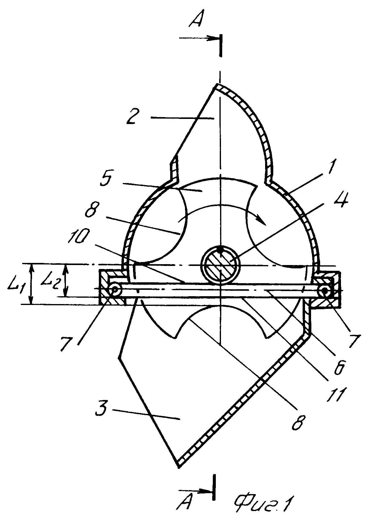 расстояние от центра каждого диска до выреза выбрано не меньше расстояния от оси вала по нормали до нерабочей кромки ленточного ножа. На фиг.1 изображена конструкция