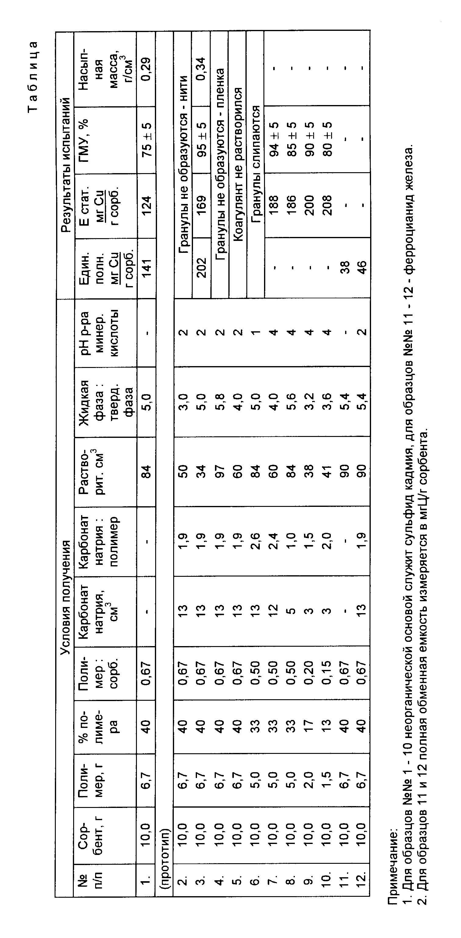 условиях по описанной выше методике. Результаты испытаний приведены в таблице. Пример 4. Проводят испытания сорбентов на основе сульфида кадмия,