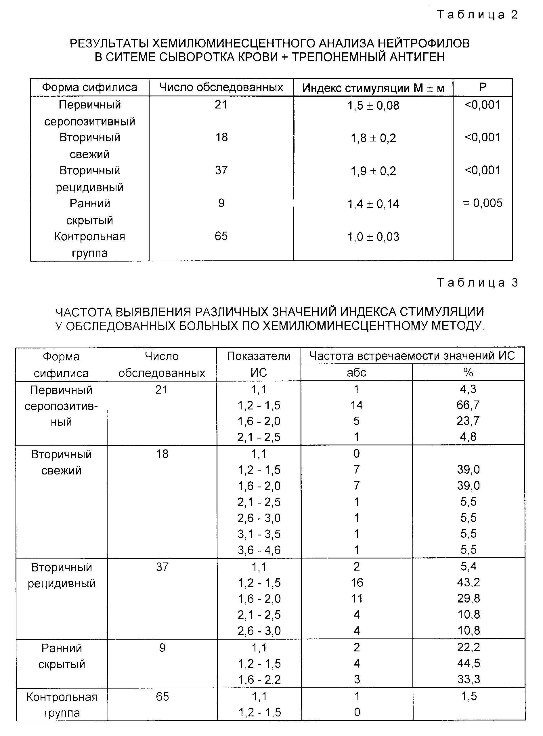 результатов предлагаемого способа представлено в таблице 2. Достоверно повышенные индексы стимуляции, отражающие наличие противотрепонемных антител, убедительно указывают на динамику