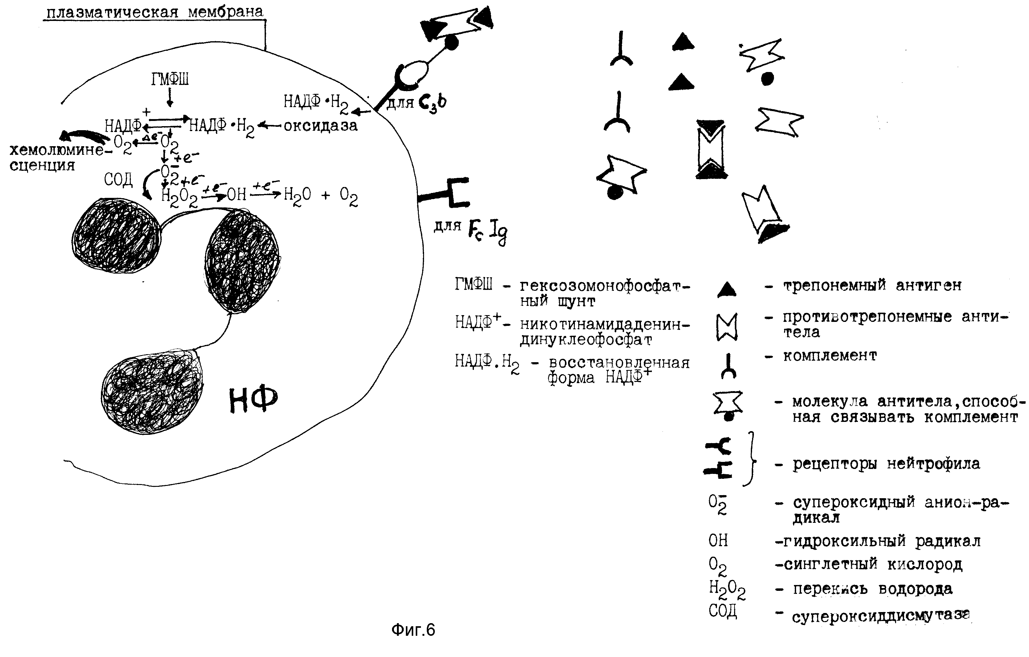 нейтрофиле и макрофаге. Новосибирск, 1983, с. 9-11, 38-46). Схему реакции нейтрофила в виде хемилюминесцентного эффекта под воздействием иммунных комплексов (трепонемный