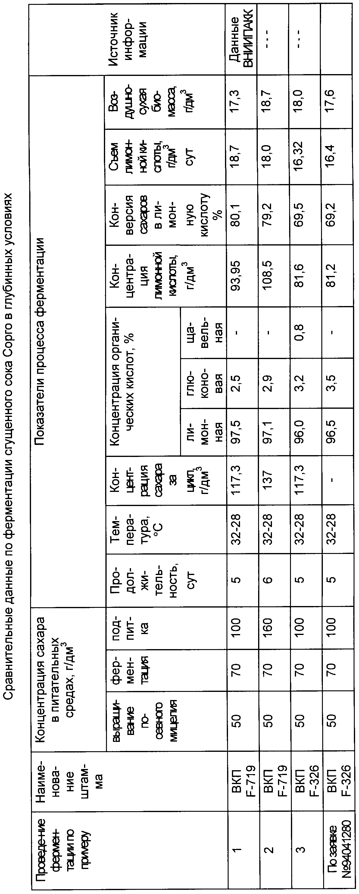 глубинного культивирования на средах из сгущенного сока сорго. В качестве прототипа выбран известный промышленный штамм гриба Aspergillus niger ВКПМ F-326 продуцент лимонной кислоты,