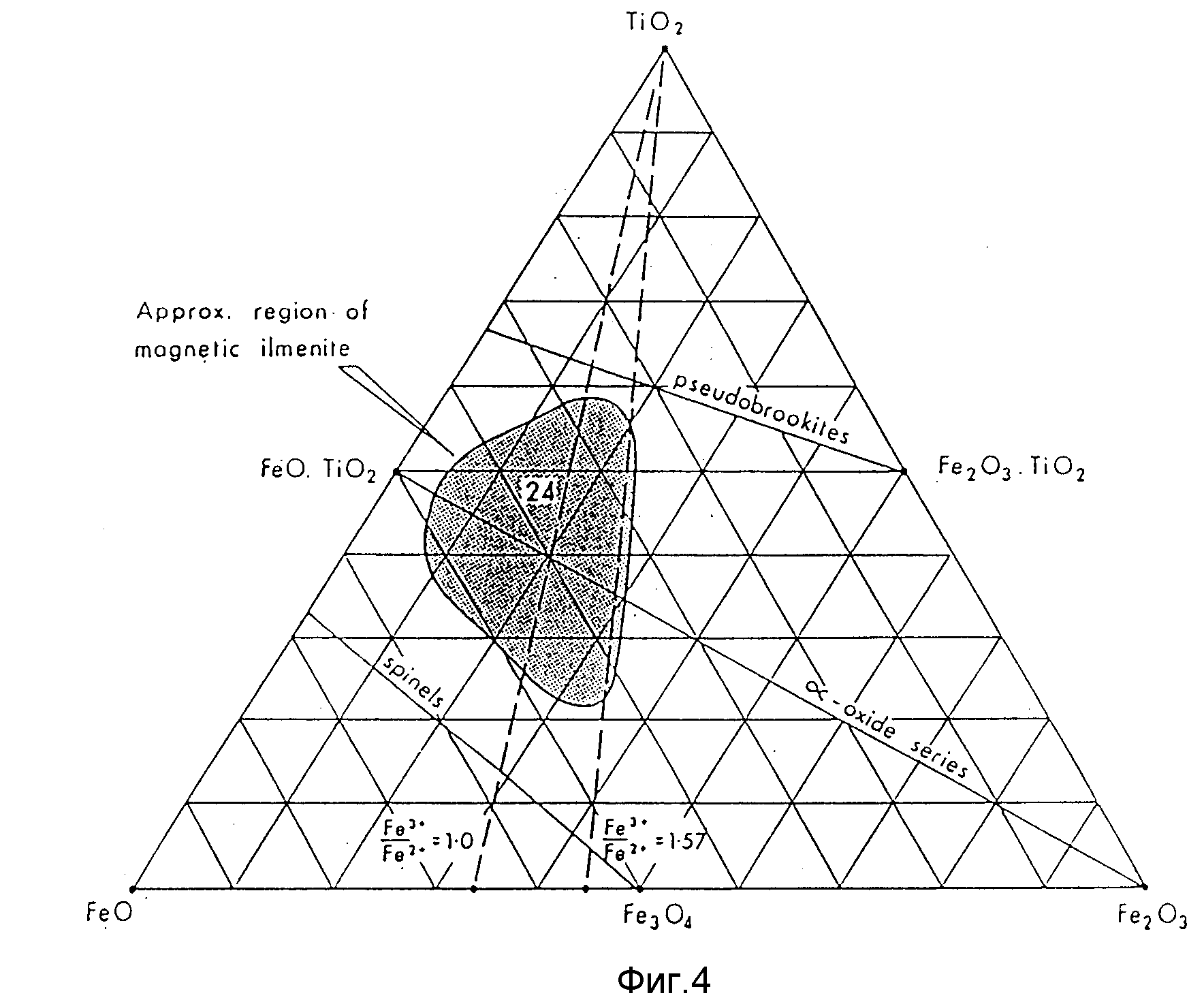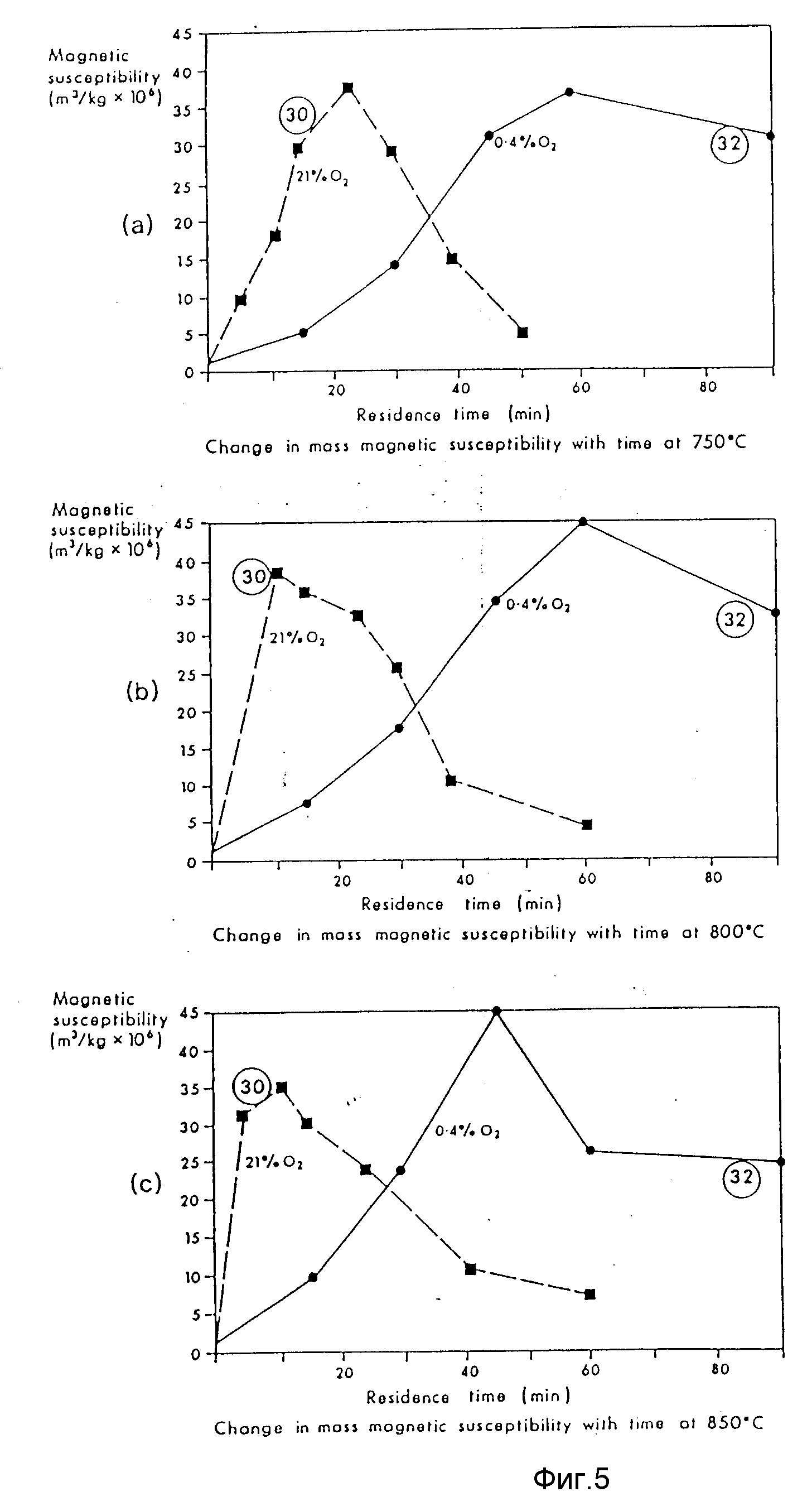 изменения магнитных свойств (фиг. 5) за счет регулирования содержания кислорода таким образом, что для ильменитов с высоким мольным соотношением Fe2O3 FeO скорость прямой реакции