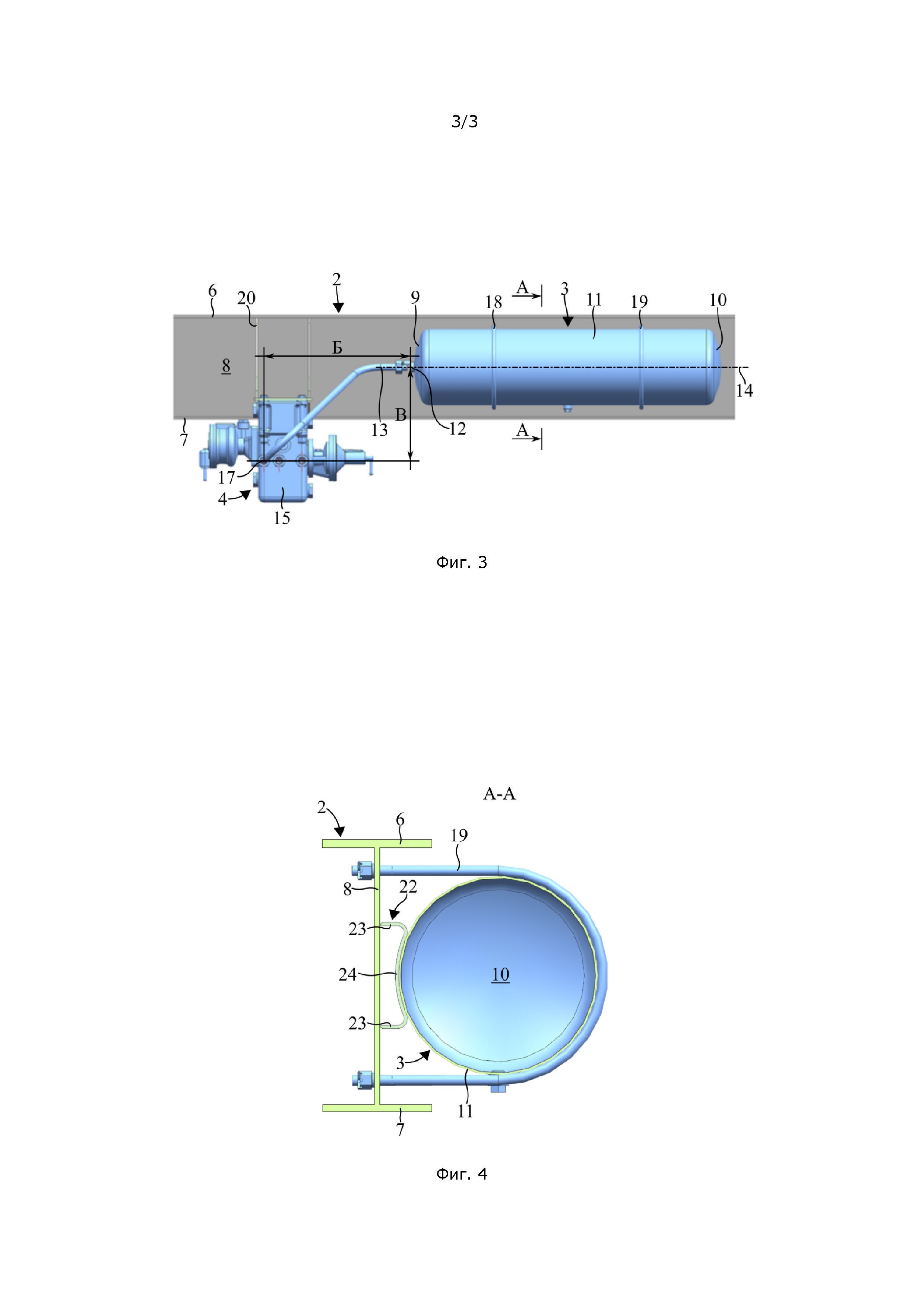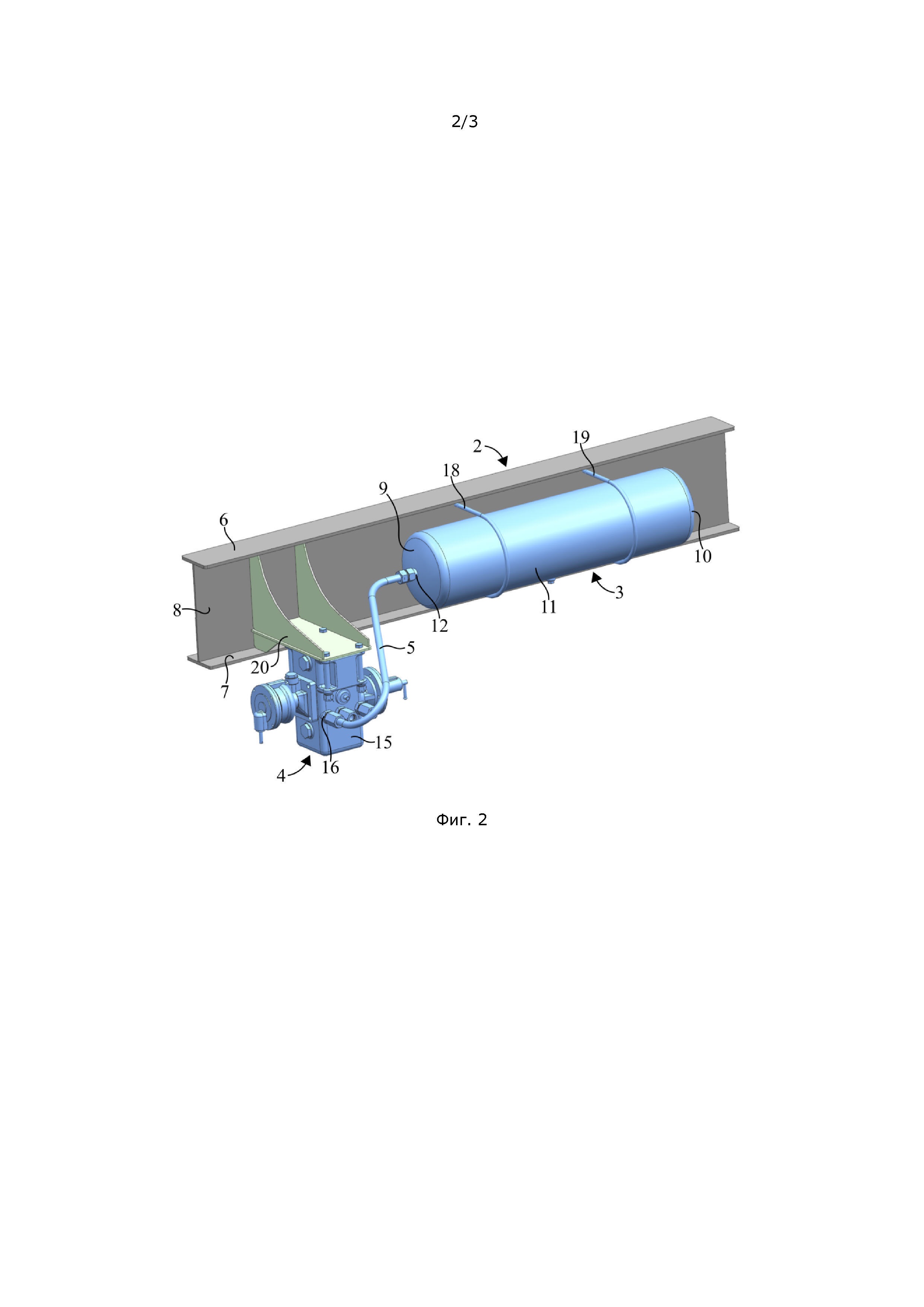 Область техники, к которой относится полезная модель [0001] Предложенная полезная модель относится к конструкциям узлов крепления воздушного резервуара и воздухораспределителя к раме вагона, в частности грузового. Уровень техники [0002] Из уровня техники известен узел крепления воздушного резервуара и воздухораспределителя к раме вагона, раскрытый в патенте России № 187567 на полезную модель, опубл. 12.03.2019 г., и принятый в качестве наиболее близкого аналога. Известное техническое решение содержит боковую балку, воздушный резервуар, средство крепления воздушного резервуара к боковой балке, воздухораспределитель и кронштейн, соединённый с воздухораспределителем и боковой балкой, при этом боковая балка включает в себя вертикальную стенку, воздушный резервуар содержит штуцер для подключения воздухораспределителя, а воздухораспределитель содержит штуцер для подключения воздушного резервуара, включающий в себя привалочную плоскость и отверстие. При этом крайние точки сечения закреплённого воздушного резервуара и крайние точки сечения закреплённого воздухораспределителя плоскостями, перпендикулярными к наружным поверхностям вертикального листа балки, располагаются по разные стороны от вертикального листа боковой балки. [0003] Недостатком известного технического решения является метод крепления воздухораспределителя к балке. У рамы вагона и воздушного резервуара имеются собственные частоты колебаний. Частота колебаний воздушного резервуара меньше частоты колебаний рамы вагона, что повышает вероятность совпадения частот колебаний, приводящей к появлению резонансных колебаний с высокой амплитудой, что может привести к излому, например, усталостному, штуцера воздушного резервуара и выходу из строя тормозной системы вагона в целом. Кроме того, в месте затяжки хомутов может произойти смятие воздушного резервуара. [0004] Техническая проблема решается созданием устройства, в котором устранён указанный выше недостаток. Раскрытие сущности полезной модели [0005] Технический результат заключается в повышении надёжности тормозной системы вагона за счёт снижения вероятности повреждения воздушного резервуара. [0006] Технический результат достигается за счёт того, что узел крепления воздушного резервуара и воздухораспределителя к балке рамы вагона содержит средство крепления воздушного резервуара, включающее в себя хомуты, при этом воздушный резервуар включает в себя штуцер для подключения воздухораспределителя, воздухораспределитель содержит штуцер для подключения воздушного резервуара, воздушный резервуар и воздухораспределитель смонтированы на общей балке по одну сторону указанной общей балки, при этом воздушный резервуар установлен на стенке балки посредством ложементов и хомутов. [0007] В дополнительном аспекте предложенное техническое решение характеризуется тем, что концы хомутов выполнены с резьбой, пропущены через отверстия, выполненные в стенке балки, и зафиксированы гайками. [0008] В дополнительном аспекте предложенное техническое решение характеризуется тем, что хомуты установлены в вертикальных плоскостях соответствующих ложементов. [0009] В дополнительном аспекте предложенное техническое решение характеризуется тем, что расстояние Б от оси отверстия штуцера для подключения воздушного резервуара возд