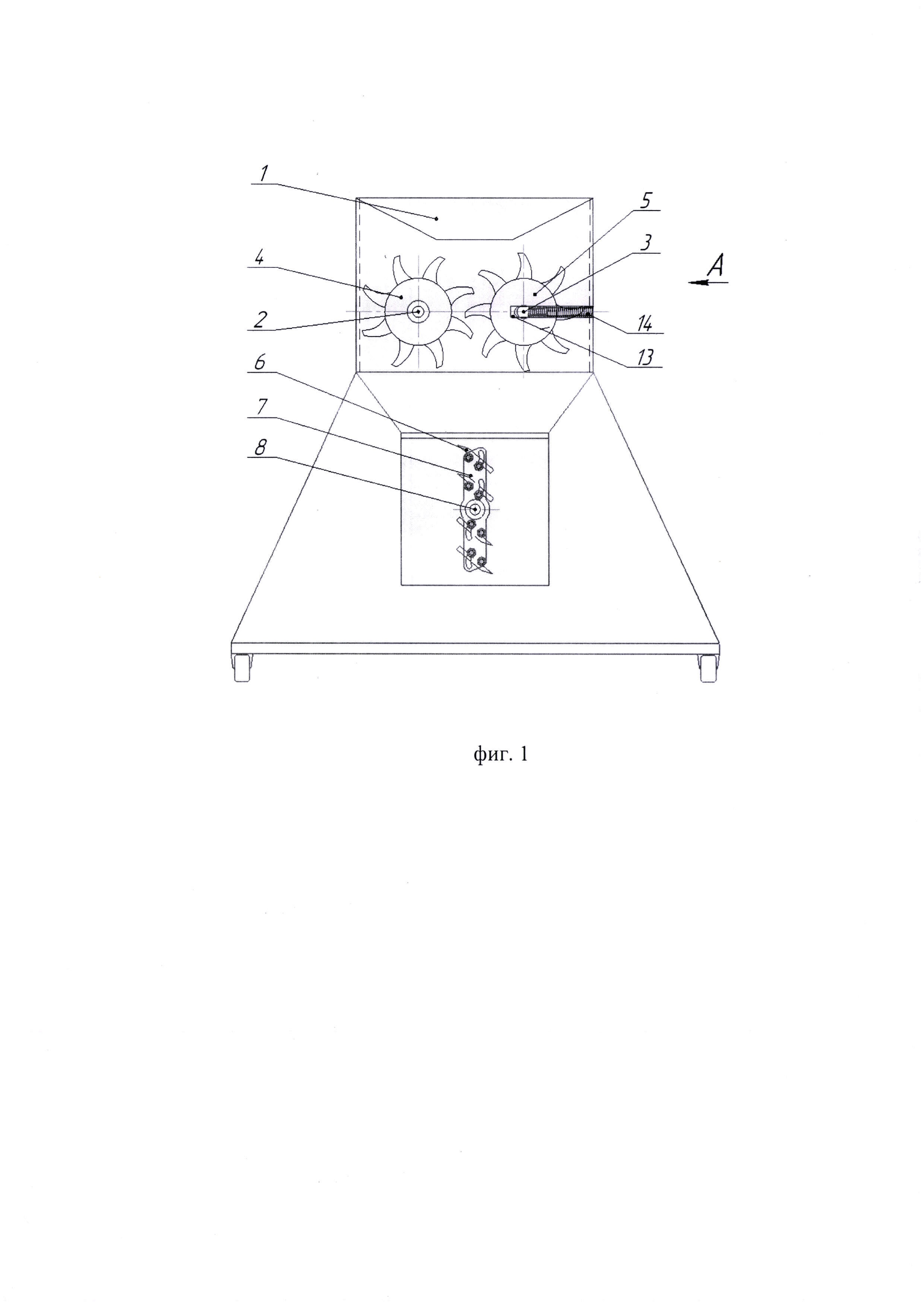 Полезная модель относится к устройству измельчителей, применяемых в области сельского хозяйства. Устройство предназначено для измельчения отходов садоводства и полеводства, закладываемых в компост. Известен измельчитель растительных материалов (Патент на полезную модель RU № 177957, Российская Федерация, B27L 11/06, G05D 17/00 / Измельчитель древесно-растительных отходов / А.В. Капитонов; 19.03.2018 Бюл. № 8), который содержит жесткую раму, на которой размещен режущий узел, соединенный с двигателем, передающим крутящий момент, с загрузочным бункером и выходным патрубком, загрузочный бункер снабжен направляющим устройством, при этом режущий узел содержит корпус с установленными на нем вращающимся валом, двумя неподвижными опорами и сито, установленное между режущим узлом и выходным патрубком. Недостатком данного измельчителя является то, что он имеет один режущий аппарат и много этапов измельчения. Известен измельчитель древесно-растительных отходов (Патент на полезную модель RU № 111967, Российская Федерация, A01F 29/00/ Измельчитель древесно-растительных отходов / Е.Г. Лумисте, Т.В. Панова, М.В. Панов, С.Н. Шмигирилов, К.О. Лумисте; 10.01.2012 Бюл. № 1), выполненный из двух секций с единым приводным валом, в котором одна секция с режущим аппаратом в виде зубчатого валка, предназначеного для измельчения веток, вторая - с режущим аппаратом в виде ножей, закрепленных на штифтах и непосредственно на валу, предназначенных для измельчения волокнистого растительного материала. Недостатком данного измельчителя является то, что он состоит из двух секций и требует разделения по видам растительного сырья, а также расположение режущих аппаратов в различных секциях делает процесс измельчения недостаточно эффективным. Поставленный технический результат полезной модели решается применением измельчителя древесно-растительных отходов, отличающегося тем, что для измельчения отходов садоводства и полеводства имеется один бункер с двумя видами режущего аппарата, в частности, в верхней части секции размещены два зубчатых валка, предназначенные для первичного измельчения веток и волокнистого материала различного диаметра и размера, один из которых закреплен на оси без возможности перемещения в горизонтальной плоскости, а второй закреплен на оси, которая, в свою очередь, может передвигаться в горизонтальной плоскости, подстраиваясь под размер измельчаемого материала, в нижней части бункера размещен режущий аппарат в виде ножей, закрепленных на штифтах и непосредственно на валу, предназначенный для окончательного измельчения растительного материала. Применение измельчителя позволит получать массу из частиц необходимого для компостирования размера. Таким образом, предложенное техническое решение соответствует критерию «существенные отличия» и обеспечивает достижение положительного эффекта, обозначенного целью полезной модели. На фиг. 1 схематично изображен предлагаемый измельчитель древесно-растительных отходов. Конструктивно измельчитель состоит из бункера 1, выполненного из металлических листов, в стенках верхней части которого, в подшипниках закреплены горизонтальные валы 2 и 3 с режущим аппаратом для измельчения веток в виде ведущего зубчатого валка 4 и ведомого валка 5, в нижней части бункера 1 расположен режущий аппарат для измельчения волокни