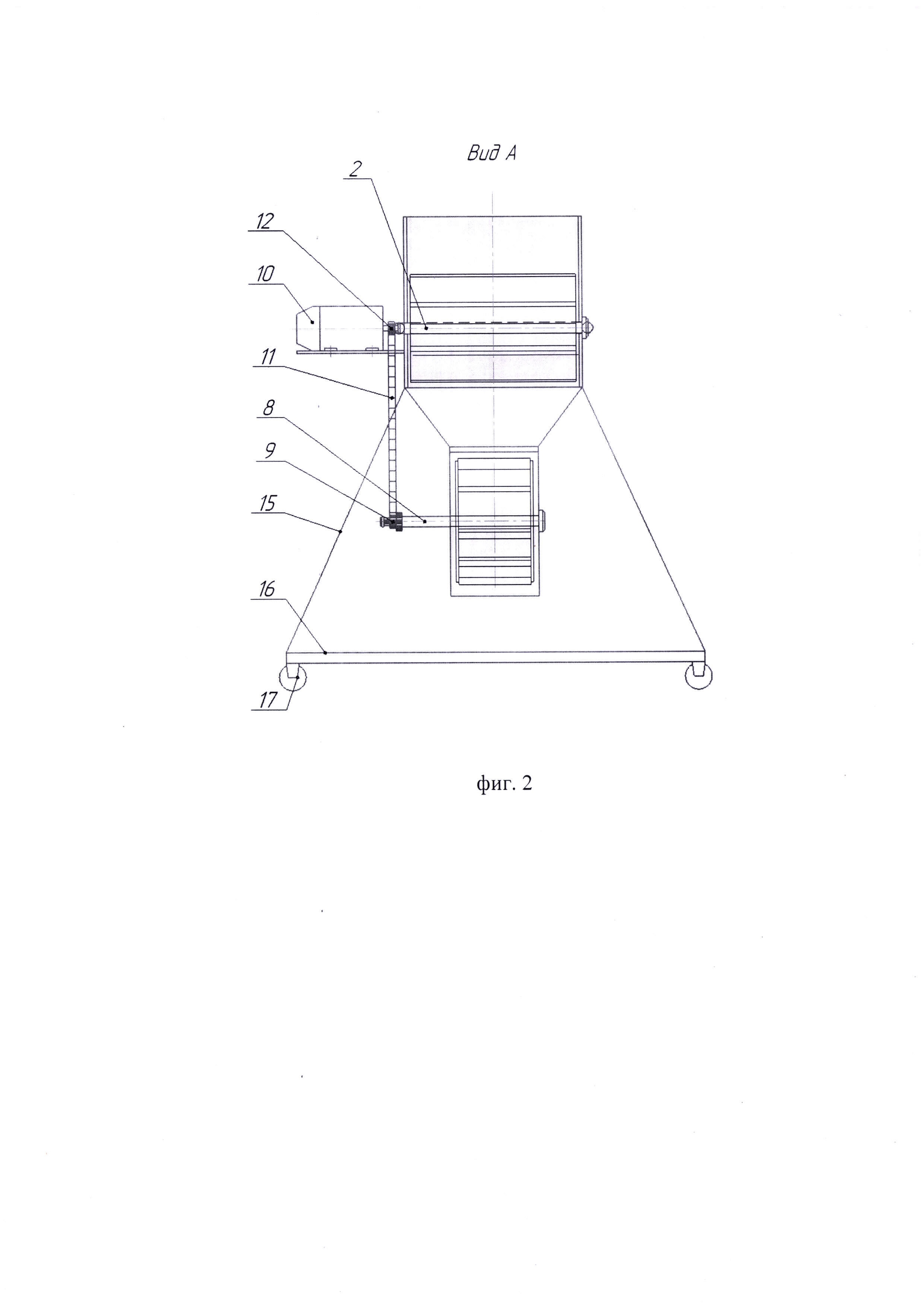 Измельчитель древесно-растительных отходов, отличающийся тем, что для измельчения отходов садоводства и полеводства имеется один бункер с двумя видами режущего аппарата, в частности, в верхней части секции размещены два зубчатых валка, предназначенные для первичного измельчения веток и волокнистого материала различного диаметра и размера, один из которых закреплен на оси без возможности перемещения в горизонтальной плоскости, а второй закреплен на оси, которая, в свою очередь, может передвигаться в горизонтальной плоскости, подстраиваясь под размер измельчаемого материала, в нижней части бункера размещен режущий аппарат в виде ножей, закрепленных на штифтах и непосредственно на валу, предназначенный для окончательного измельчения растительного материала.