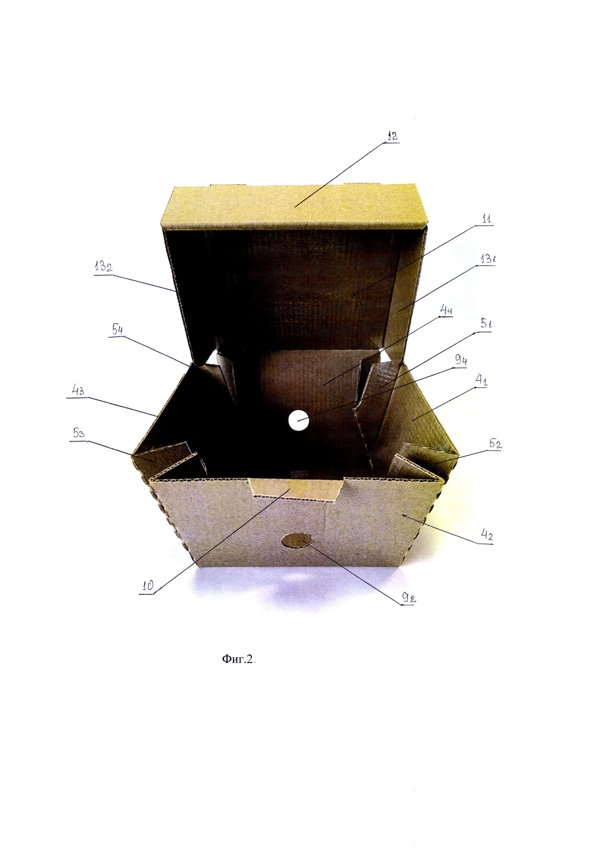 Полезная модель относится к таре из картона, предназначенной для размещения, хранения, перевозки штучных изделий различного назначения, в особенности, она удобна для использования на предприятиях фаст-фуда, в дороге или учебных заведениях для упаковки пищевых продуктов. Заявляемая полезная модель разработана, в частности, для использования на предприятиях фаст-фуда, в дороге или учебных заведениях. Известна упаковка, представленная в п. РФ №136028 по кл. B65D 85/00, 3.12.08.2013 г., оп.27.12.2013 г.. Известная упаковка характеризуется следующей формулой: Формула полезной модели: 1. Упаковка, имеющая форму, в основе которой лежит параллелепипед, выполненная посредством перегиба ее частей по линиям сгиба из листовой заготовки с образованием днища, крышки, боковых, задней и передней стенок, отличающаяся тем, что крышка выполнена с возможностью ее удержания в открытом состоянии при наличии, по меньшей мере, одной перемычки, расположенной между боковой стенкой и крышкой, при этом перемычка и боковая стенка соединены между собой через линию ослабленной прочности. 2. Упаковка по п. 1, отличающаяся тем, что на перемычке выполнен клапан. 3. Упаковка по п. 2, отличающаяся тем, что перемычка и клапан соединены через линию ослабленной прочности. 4. Упаковка по п. 1, отличающаяся тем, что она снабжена, по меньшей мере, одним клапаном. Упаковка изготовлена из бумаги. Недостатком известной упаковки являются ее не вполне удовлетворительные эксплуатационные характеристики, такие как ее прочность и надежность сохранения в ней продукта, обусловленные как выполнением ее из бумаги, так и особенностями конструкции. Известная коробка имеет форму параллелепипеда, в котором передняя и задняя стенки в несколько раз длиннее торцевых стенок и при небольшой ее высоте в процессе транспортировки достаточно плоская коробка в форме параллелепипеда может оказаться в положении на ребре: в этом положении продукт, упакованный и уложенный и в коробку, под собственным весом смещается к нижней стенке, расширяет расстояние между центральными частями дна и крышки, разворачивается боком. В результате такой неуправляемой перегруппировки содержимого коробки продукт теряет товарный вид и качество. Все это может происходить потому, что центральные части дна и крышки плоской коробки, какими бы их жесткими не выполняли, под тяжестью продукта отходят друг от друга, вспучиваются, а продукт смещается со своего места, ложится на бок, что приводит к потере им товарного, потребительского вида. Выполнение упаковки из бумаги делает ее прочность очень уязвимой и ненадежной. Кроме того, в наглухо закрытой коробке при хранении продукт может испортиться. Наиболее близкой по технической сущности к заявляемой представляется упаковка, представленная в п. РФ №27579 по кл. B65D 85/00, з. 01.10.2002 г., оп.01.10.2002 г. и выбранная в качестве прототипа. Известная упаковка характеризуется следующей формулой: Упаковка, содержащая выполненные из картона основание и крышку замкнутой конструкции, образованную двумя частями - нижней в виде прямоугольного параллелепипеда и верхней - в форме усеченной четырехугольной пирамиды, отличающаяся тем, что крышка выполнена из единой плоской заготовки, центральная часть которой, являющаяся верхним основанием пирамиды, имеет форму квадрата, две боковые противоположные грани пирамиды 