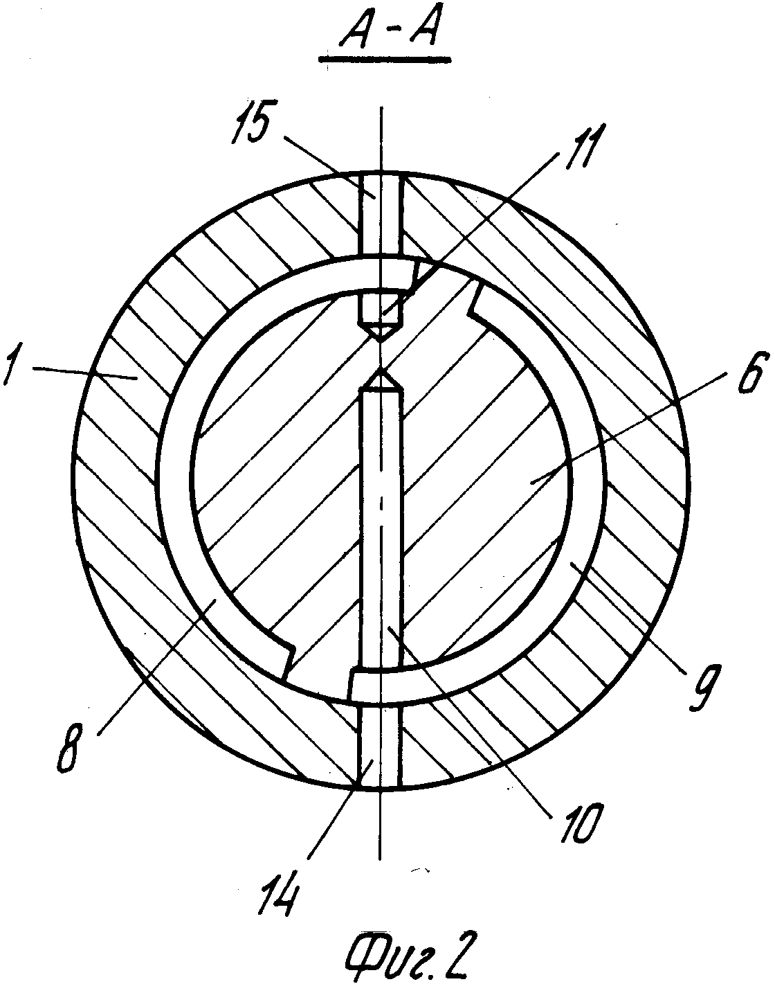 Гидромашина работает, например, в режиме насоса следующим образом. При вращении вала 2 шарнирно соединенные с ним поршни 4 вращают блок цилиндров 5 и совершают относительно него возвратно-поступательные движения при наличии угла между осью вала2 и осью блока цилиндров 5. За один оборот вала 2 каждый поршень 4 совершает двойной ход, за первую половину оборота поршень всасывает рабочую жидкость, за вторую - нагнетает ее в гидросистему. Цилиндры блока 5 соединены каналами с окнами 12 на распределителе в течении одной половины оборота, а с окном 13 - в течение второй половины. Рабочая жидкость по каналам 1 и 11 подается в дугообразные окна 8 и 9 на боковой поверхности распределителя. Соосно с ними на внутренней поверхности корпуса 1 выполнены окна 14 и 15, через которые жидкость подается из всасывающей магистрали в нагнетательную магистраль. При повороте распределителя 6 относительно его оси регулирующим устройством изменяется угол между осью вала 2 и блока 5, что вызывает изменение хода поршней 4 и в свою очередь изменение рабочего объема гидромашины. При реверсировании рабочего потока распределитель 6 поворачивается регулирующим устройством таким образом, чтобы качающий узел прошел зону минимального угла наклона блока цилиндров 5 к оси вала 2. В этом положении ввиду того, что ширина окон 8 и 9 меньше ширины перемычки между окнами 14 и 15, магистрали нагнетания и всасывания отсоединяются от полостей цилиндров. После прохождения крайних точек коммутация потоков, проходящих через распределитель 6, меняется на противоположную.