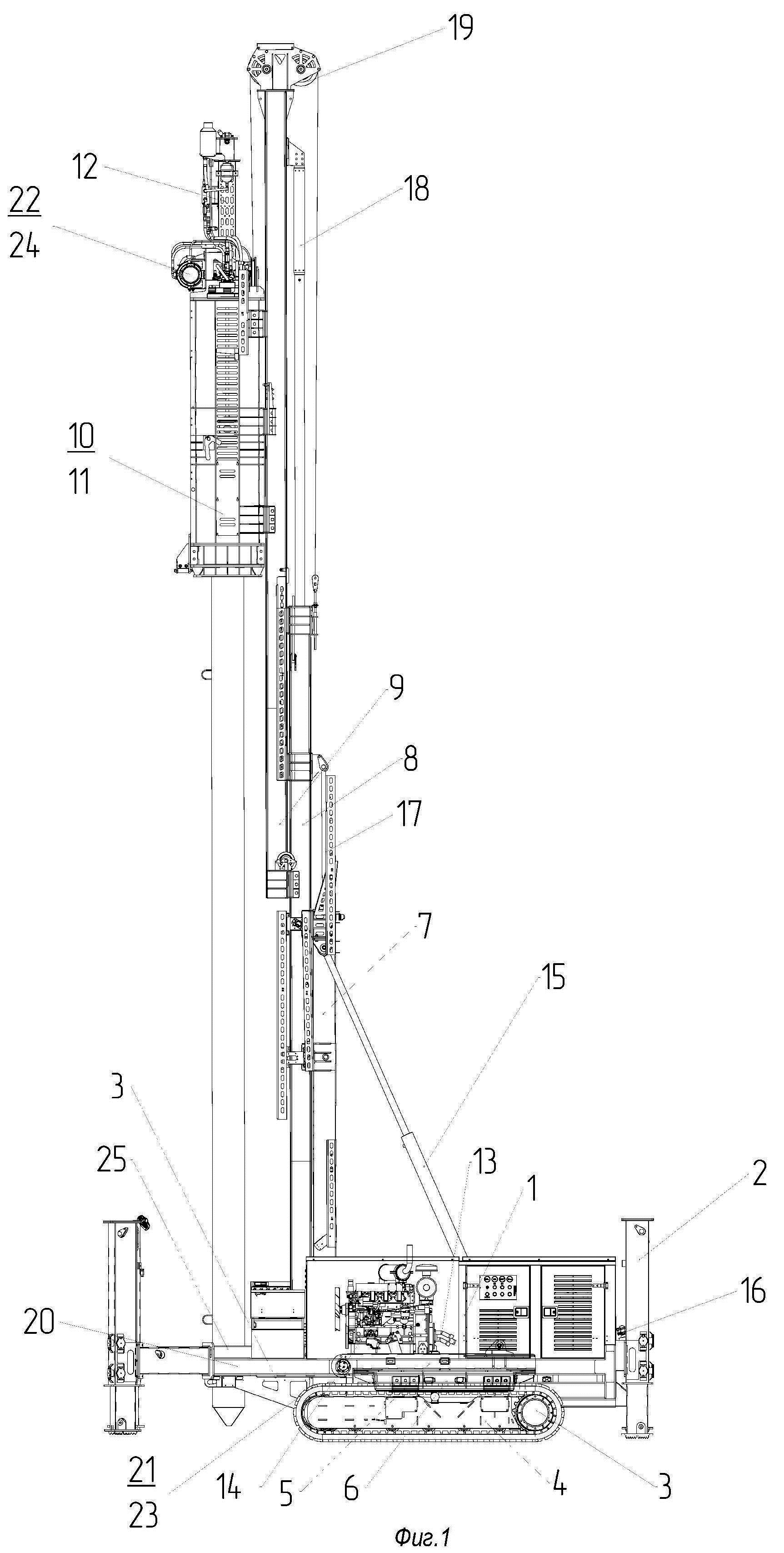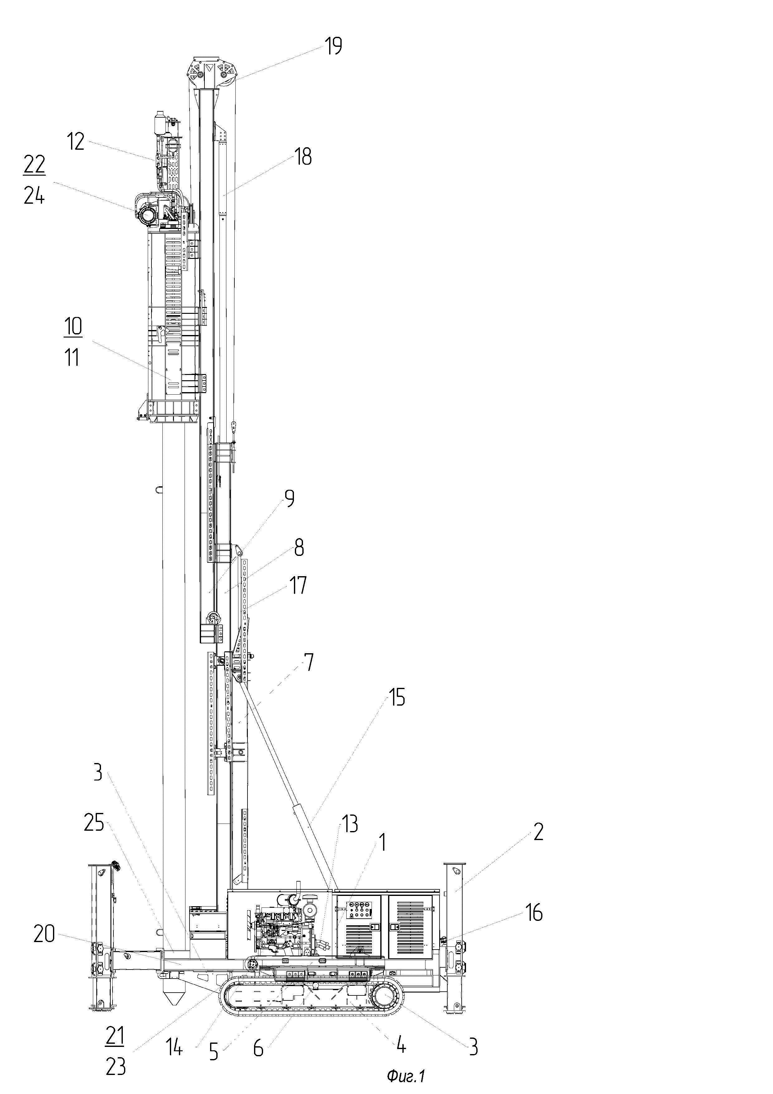 Подъемная секция (7) мачты обеспечивает переход ее из горизонтального (транспортного) положения в вертикальное (рабочее) при помощи трех гидроцилиндров: двух гидроцилиндров подъема (15) и выталкивающего гидроцилиндра (16), который действует на малых углах подъема мачты. Опорная секция (8) сдвигается вниз гидроцилиндром (17) и опирается пяткой в землю для увеличения стабильности. Направляющая секция (9), закрепленная на опорной секции (8), поднимается вверх гидроцилиндром (18) для увеличения полезной длины забиваемой сваи, и посредством системы тросов, проходящих через блок (19), поднимает корзину (10), в которой располагается молот (11), приводящийся в движение гидроцилиндром (12).