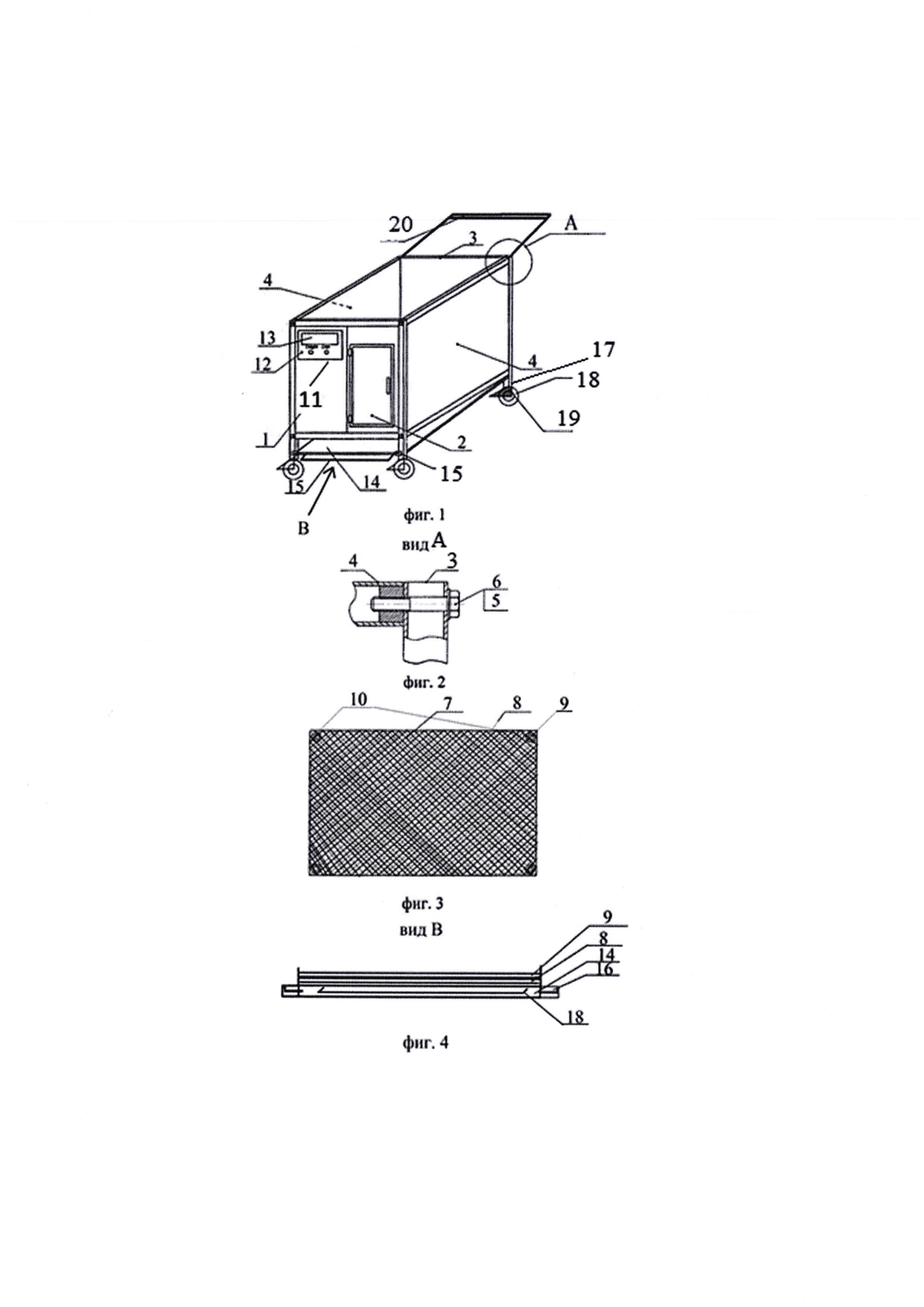 Полезная модель относится к сельскому хозяйству, а именно к животноводству, и предназначена для индивидуального содержания новорожденных телят. Известна конструкция клетки для телят (см. патент на полезную модель РФ №71210), содержащая переднюю, заднюю и боковые стенки, выполненные в виде решетки, входную дверь, держатели для съемных кормушек, установленные на передней стенке и пол. На передней, задней стенках и в средней части клетка оборудована планками, расположенными выше боковых стенок и соединенными сверху горизонтальными перекладинами, на которые устанавливается съемная крыша под углом 3-10° к горизонтали от передней стенки к задней, в боковом окне на передней стенке смонтированы крепления для установки подвесного держателя сосковой поилки. Недостатком данной конструкции является то, что клетка не имеет функции взвешивания новорожденного теленка, а служит только для его содержания. Известна конструкция клетки (см. http://skotnyidvor.ru/soderzhanie-telyat.html), содержащая переднюю стенку с дверцей, заднюю и боковые стенки, дно выполнено в виде поддона с уклоном для удобства уборки навоза. Известна также клетка для индивидуального содержания новорожденных телят (патент РФ №141848, кл. A01K 1/02, 2014 г. - прототип), состоящая из боковых, задней и передней стенок с дверцей, установленных на подставках, поддона, дна с ячейками, датчики, передающие вес теленка на цифровое табло индикации, расположенное на передней стенке. Недостатком прототипа является то, что теленок находится на подстилке, которая загрязняется его отходами жизнедеятельности, в результате увеличивается влажность, которую необходимо постоянно убирать, чтобы теленок не заболел, что требует дополнительных затрат ручного труда на обслуживание. Технический результат достигается тем, что в клетке для индивидуального содержания новорожденных телят, состоящей из боковых, задней и передней стенок с дверцей, установленных на подставках, поддона, дна с ячейками, датчиков, передающих вес теленка на цифровое табло индикации, расположенное на передней стенке, согласно полезной модели дно снабжено нижним сетчатым настилом и верхним сетчатым настилом с ячейками меньшего размера, чем ячейки нижнего сетчатого настила, при этом сетчатые настилы дна соединены между собой, весовые датчики установлены на дне клетки, поддон имеет ручки для его выдвижения и замки для фиксации, а подставки в нижней части снабжены поворотными опорами и имеют фиксаторы в виде ножного тормоза, причем верхняя часть подставок задней стенки имеет рукоятку для удобства транспортировки всей клетки. Новизна заключается в том, что за счет конструктивных особенностей обеспечивается снижение трудозатрат, повышение эффективности содержания телят, удобство в очищении навоза и транспортировке устройства. Сущность полезной модели поясняется чертежом, где на фиг. 1 представлена общий вид клетки для индивидуального содержания новорожденных телят; на фиг. 2 представлен вид А механизма крепления боковых стенок клетки к передней и задней стенкам; на фиг. 3 - сетчатый настил; на фиг. 4. представлен вид В торца нижней части клетки, где расположены: верхний 9 и нижний 8 сетчатые настилы, поддон 14, ручка 15, замки для фиксации 16 поддона. Клетка для индивидуального содержания новорожденных телят состоит из передней стенки 1 с дверцей 2 для п