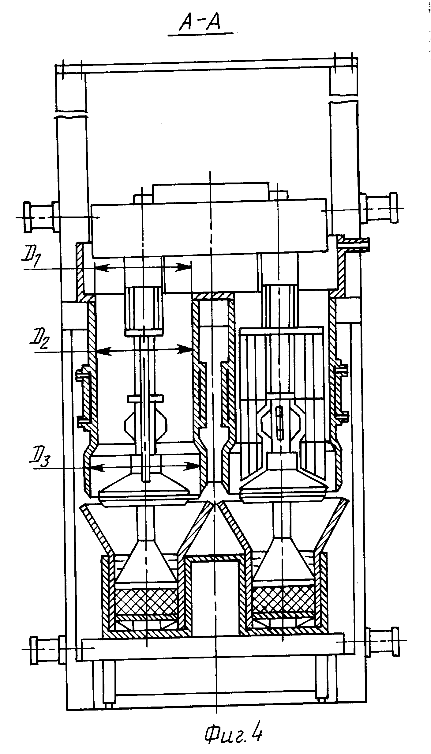 цилиндрическим обечайкам 5 снизу пристыкованы полые цилиндрические насадки 7 с внутренним диаметром D3, большим, чем внутренний диаметр D2 обечаек. Внутренняя