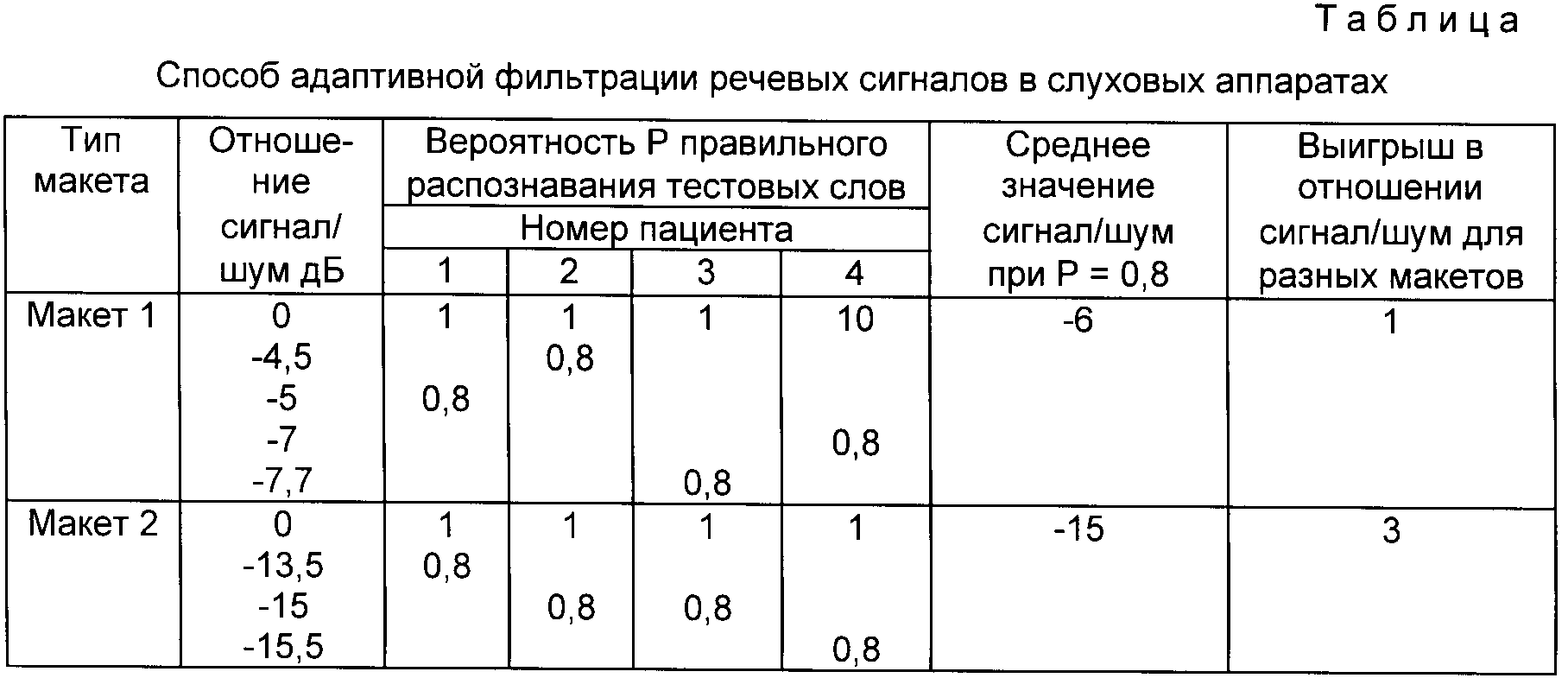 способа адаптивной фильтрации речевого сигнала (макет 2). Из результатов экспериментов, приведенных в таблице, следует, что использование предлагаемого способа адаптивной фильтрации