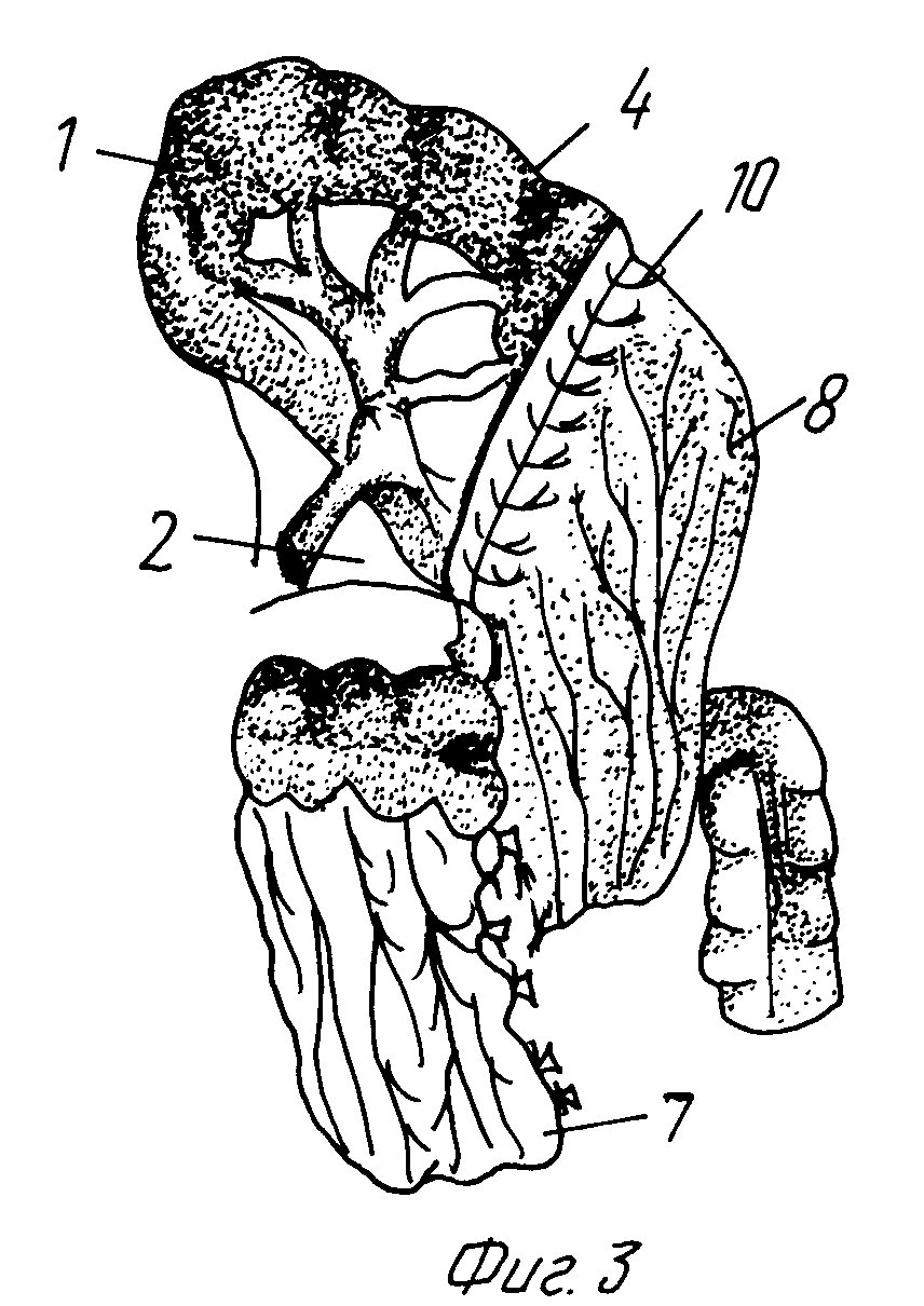 осевым кровоснабжением, 9 - срез селезенки, 10 - нити, которыми сальник подшивают к селезенке. Предлагаемый способ осуществляют следующим образом. При