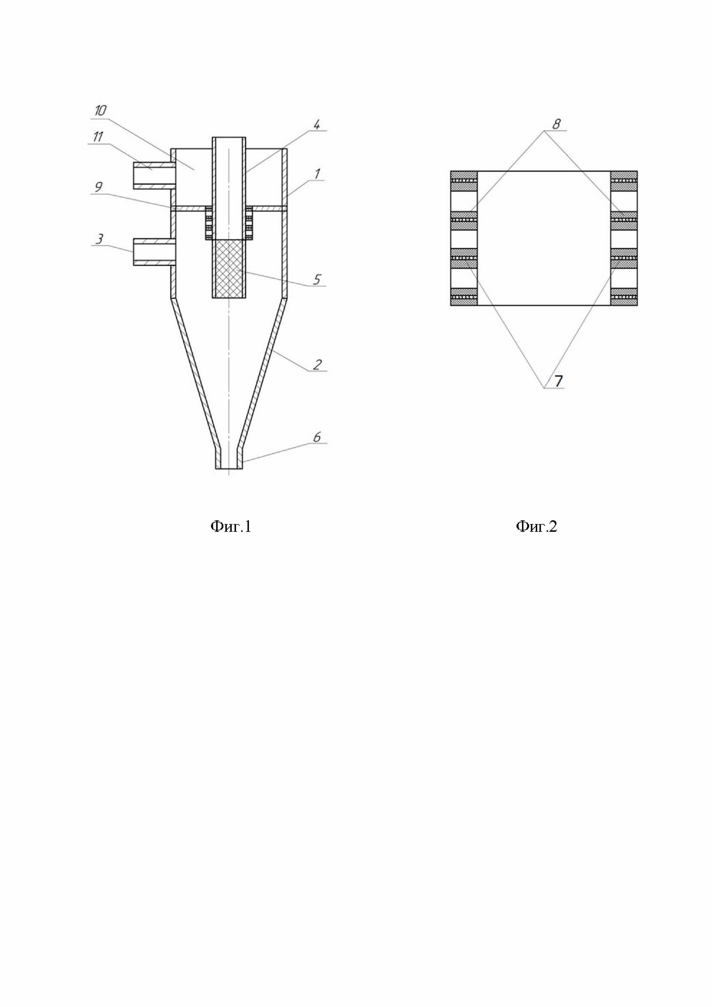 Гидроциклон, включающий сопряженные цилиндрическую и коническую обечайки, тангенциальный ввод для подачи исходного продукта, песковый патрубок для вывода тяжелого продукта, сливной патрубок для вывода осветленного продукта, снабженный фильтрующим элементом с фильтрующей боковой поверхностью и сорбционным фильтром, погруженным по верхний край тангенциального ввода, установленным коаксиально со сливным патрубком и размещенным на диске, образующим сверху в цилиндрической обечайке дополнительную камеру для сбора осветленного продукта, снабженную дополнительным сливным патрубком для вывода осветленного продукта, причем сорбционный фильтр образован размещенными на расстоянии 15 мм одно от другого перфорированными кольцами с диаметром перфораций 2 мм, покрытыми снизу и сверху слоем фильтровального сорбирующего материала толщиной 4 мм из синтетических и натуральных волокон.