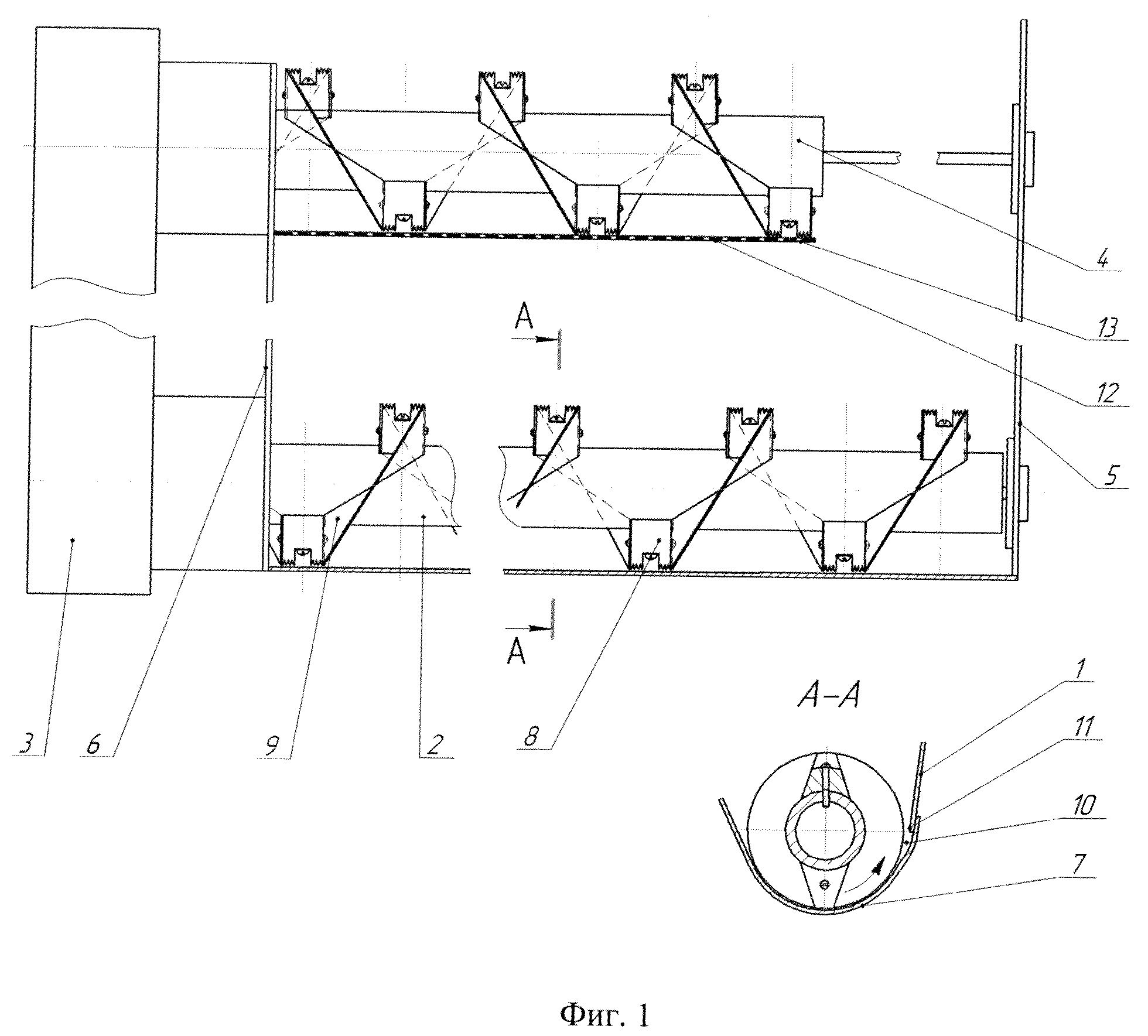 Заявляемая полезная модель относится к сельскохозяйственному машиностроению и может быть использована в зерноуборочных комбайнах для домолота колосового вороха, поступающего с очистки комбайна. Известно устройство домолота колосового вороха, содержащее кожух колосового шнека, элеватор колосовой, распределительный шнек и шнековый барабан, установленный в кожухе колосового шнека и шарнирно зафиксированный одним концом на фланце, закрепленном на кожухе колосового шнека, а другим концом - на опоре колосового элеватора, при этом на шнековом барабане винтообразно расположены кронштейны с закрепленными рифлеными бичами, а между кронштейнами установлены винтообразно расположенные сектора, перемещающие обмолоченный ворох в приемное окно колосового элеватора (патент РФ на полезную модель №153225 A01F 12/18). В задачу авторов этой модели входило упрощение конструкции, уменьшение повреждения зерна и повышение надежности технологического процесса. Эти задачи авторами решены, однако в конструкции имеется недостаток. Недостатком известной полезной модели является высокая вероятность недомолота колосового вороха, особенно слегка увлажненного. Предложенная авторами замена стандартного домолачивающего барабана на шнековый барабан далеко не полноценна, и если не вводить дополнительных устройств, то колосовой ворох останется недомолоченным. Стандартный домолачивающий барабан ударяет своими бичами по колосьям со скоростью 28 м/с, кроме того, под бичами имеются неподвижные выступы деки, притормаживающие движение колосьев, чтобы увеличить ударное воздействие. Предложенный авторами шнековый барабан монтируется на базе стандартного колосового шнека, который имеет скорость вращения 3,3 м/с. Под шнеком днище желоба гладкое, нет никаких притормаживающих выступов, то есть не будет ни удара, ни вытирания зерен из колосьев. Это приведет к завышенным потерям урожая. Техническим результатом полезной модели является повышение качества работы домолачивающего устройства зерноуборочного комбайна. Технический результат достигается тем, что в домолачивающее устройство зерноуборочного комбайна, содержащее кожух колосового шнека, колосовой барабан с бичами, транспортирующими секторами и желобом, а также колосовой элеватор, введен распределительный барабан с бичами, транспортирующими секторами и желобом, причем в верхней части желоба каждого барабана в зоне выхода из него бичей сформировано углубление с очесывающим выступом, зазор между выступом и бичом равен 6 мм с возможностью прохождения зерна без повреждения, а желоб распределительного барабана перфорирован отверстиями, проходными для зерен. На фиг. 1 изображено домолачивающее устройство зерноуборочного комбайна. Домолачивающее устройство зерноуборочного комбайна содержит кожух 1 колосового шнека, шнековый барабан 2, колосовой элеватор 3 и распределительный барабан 4. Кожух 1 колосового шнека включает боковины 5 и 6, а также желоб 7. Базовой деталью колосового барабана 2 является его труба 2, на которой винтами закреплены бичи 8. К боковым поверхностям бичей 8 винтами прикреплены сектора 9 представляющие собой фрагменты спиральной шнековой ленты. Бичи имеют рифленую рабочую поверхность. В верхней части желоба 7 в зоне выхода бичей из желоба сформировано углубление 10 с очесывающим 