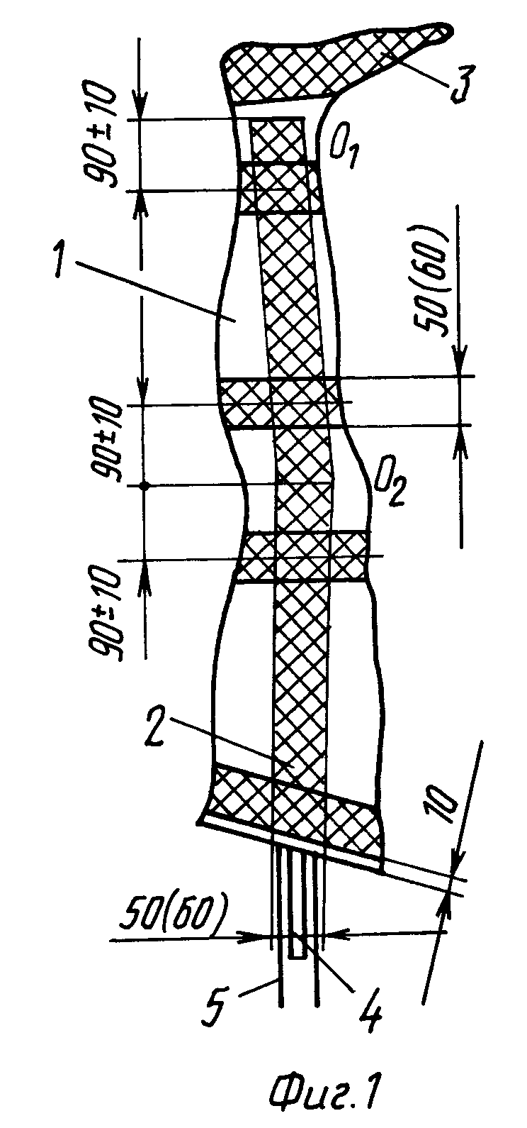лент из углеткани, а на фиг. 1 - расположение углелент на слепке - позитиве 1, где условно не показаны трикотажные трубки (рукава) и разделительные