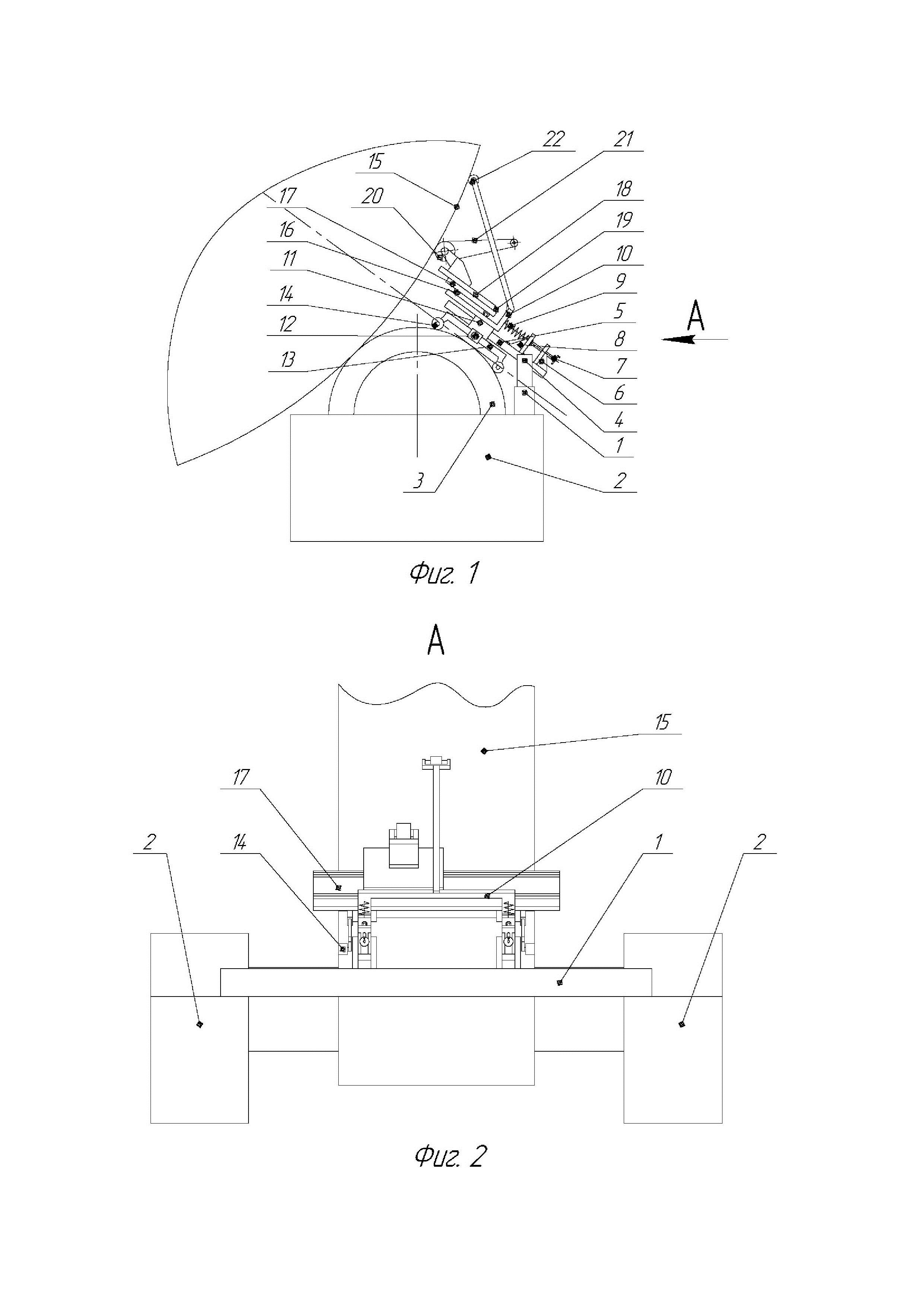 Монтажная рама 1 устанавливается на корпуса 2 подшипников опорного ролика 3 обрабатываемого бандажа. К монтажной раме 1 при помощи шарниров 4 присоединяют поперечные профильные направляющие 5, на которых установлен корпус 11 станка. Станок базируется на поверхности опорного ролика 3 бандажа с помощью роликов 14 роликовой опоры 13, а также шарнира 12. Подпружиненный кронштейн 10 подводят с помощью регулировочного винта 7, подвижного упора 8 и пружины 9 к бандажу до соприкосновения копирующего ролика 22 с обрабатываемой поверхностью бандажа 15.