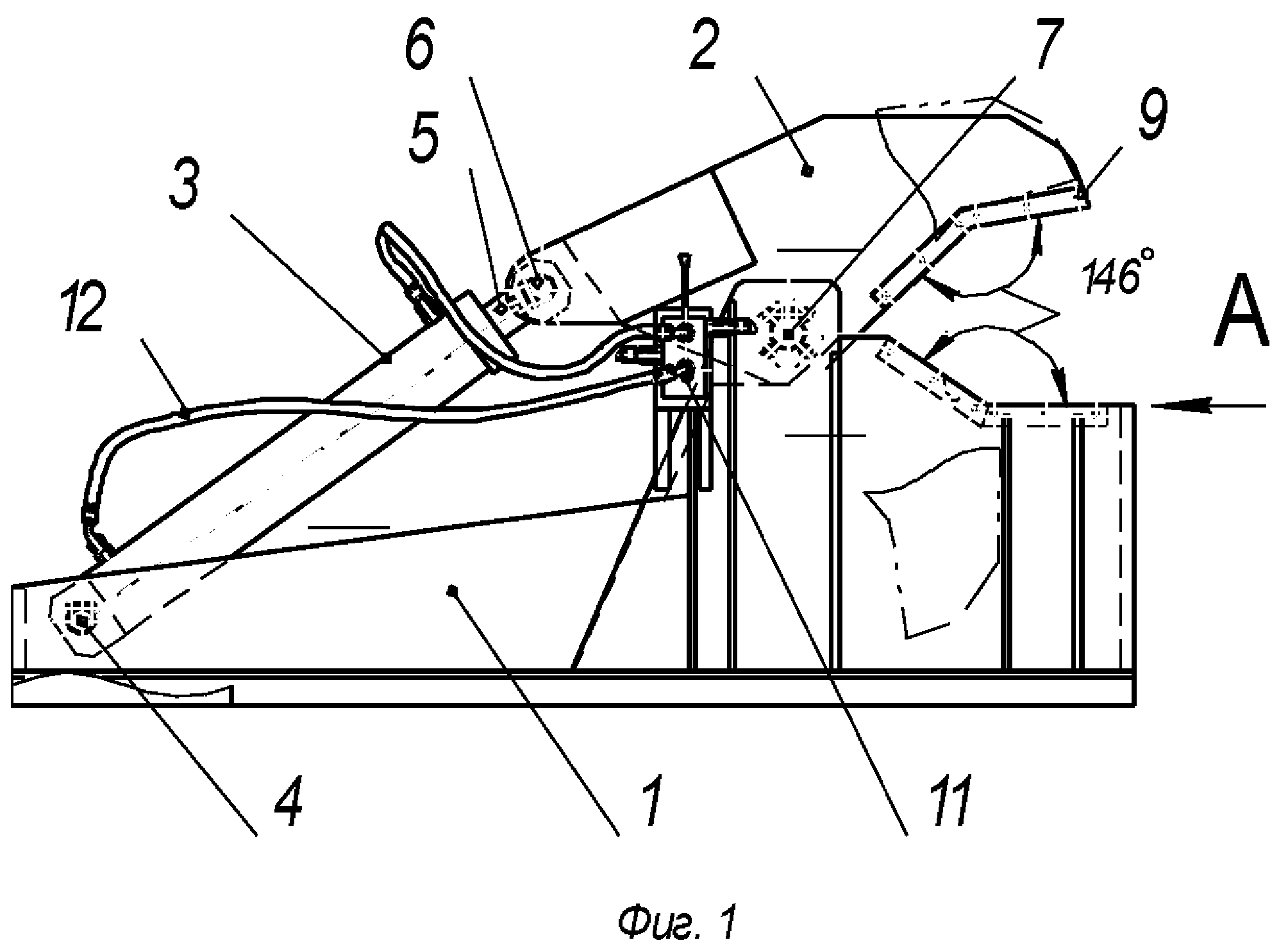 Полезная модель относится к оборудованию для резки изношенных или бракованных шин различного диаметра на фрагменты нужной ширины и длины и может быть использована в технологических линиях для переработки автошин в резиновую крошку. Известно устройство для резки изношенных шин (патент SU №1655774, МПК B26D 1/14, опубл. 15.06.91, Бюл. №22), содержащее установленные на станине механизм резки, механизм зажима, включающий основание для зажимных элементов, установленных с возможностью встречного перемещения и приводной вал, а также привод вращения механизма зажима в виде электродвигателя и связанного с ним редуктора. Механизм резки выполнен в виде дисковой пилы, кинематически связанной с электродвигателем привода вращения механизма зажима, основание механизма зажима выполнено в виде кронштейна, установленного с возможностью качания относительно оси тихоходного вала редуктора, на свободном конце которого расположены зажимные элементы. Недостатком устройства является необходимость плотного крепления шины в механизме зажима, что возможно лишь при наличии бортовой проволоки. После разрезания шины на устройстве теряется жесткость половинок и удаление проволоки целиком проблематично, а дальнейшее измельчение шин с бортовой проволокой и удаление последней из крошки многократно усложняет последующий процесс переработки. Наиболее близкой по технической сущности является установка для резки крупногабаритной и сверхкрупногабаритной шины (патент RU №125511, МПК B26D 1/01, B02C 18/00, опубл. 10.03.2013 г., Бюл. №7), содержащая раму с площадкой для укладки шины, фиксатор шины, а также нижний и верхний режущие ножи и силовой привод. Ножи выполнены Г-образной формы и установлены на двух подвижно закрепленных между собой Г-образных основаниях, образующих силовые ножницы, приводимые в движение посредством силового привода, при этом площадка для укладки шины оборудована фиксатором шины и снабжена механизмом подъема и/или наклона и/или поворота, а также механизмом линейного перемещения площадки вдоль рамы. Недостатком установки является расположение верхнего и нижнего режущих ножей только с одной стороны силовых ножниц, поэтому при разрезании крупногабаритных шин с кордом из прочной проволоки на ножи действуют существенные боковые усилия, вследствие чего последние раздвигаются и возможно замятие шин. Технические задачи заключаются в упрощении конструкции предлагаемого устройства за счет симметричного размещения лезвий с обеих сторон основания ножа и проема в станине, что снимет боковые усилия с ножа и устранит замятие шин, и расположения режущих поверхностей ножа и проема в станине под углом 146°, что позволит исключить выталкивающую силу, действующую на шину при резке. Для решения технических задач предлагаются ножницы гидравлические для резки шин, включающие сварную станину и подвижный нож, приводимый в движение силовым гидроцилиндром. Новым является то, что сварная станина в передней части имеет проем для входа ножа, причем с обеих сторон основания ножа и проема в станине симметрично размещены по два лезвия с режущими кромками, при этом режущие поверхности ножа и проема в станине образуют между собой угол 146°, также силовой гидроцилиндр посредством пальца подвижно закреплен на станине, а его шток соединен при помощи пальца с ножом, причем нож при