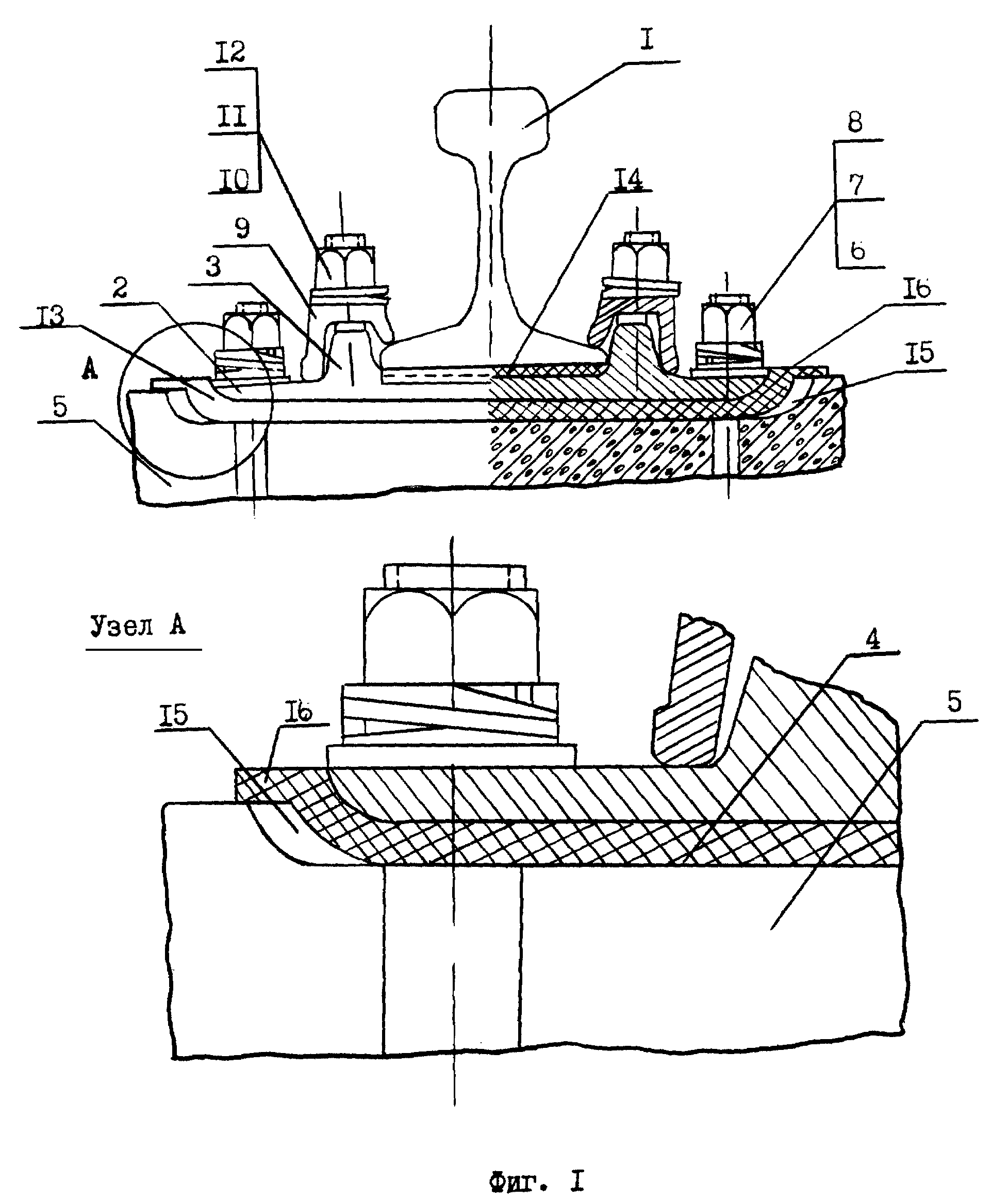 прокладки. При сборке рельсошпальной решетки в нише 4 железобетонной шпалы 5 размещается нашпальная прокладка 13, на которую укладывается металлическая подкладка 2 и устанавливаются