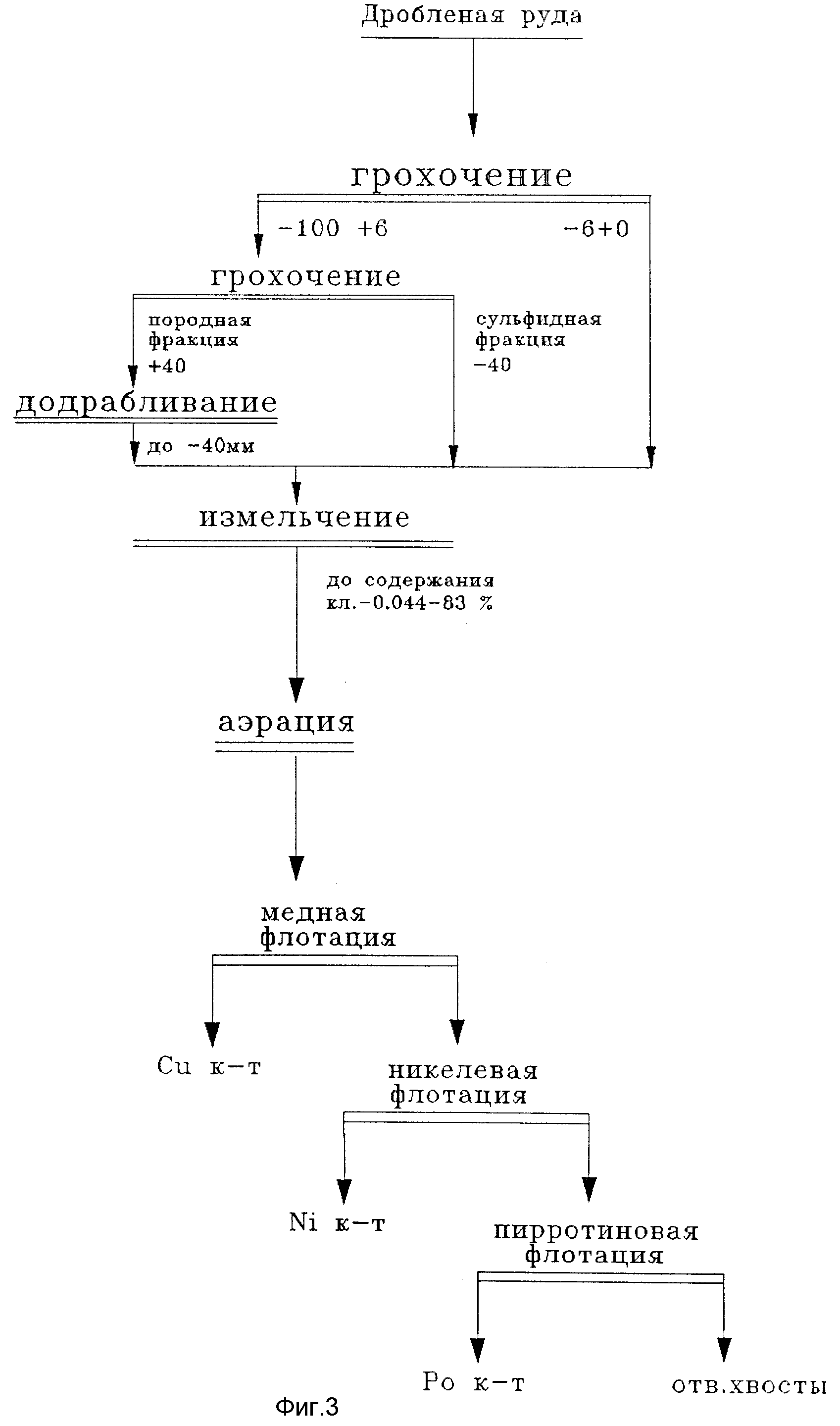 додрабливают до крупности 35 мм, подают на мельницы и измельчают до содержания класса крупности 0,071 - 75%. Измельченные сульфидную и породные фракции смешивают, аэрируют в присутствии собирателя