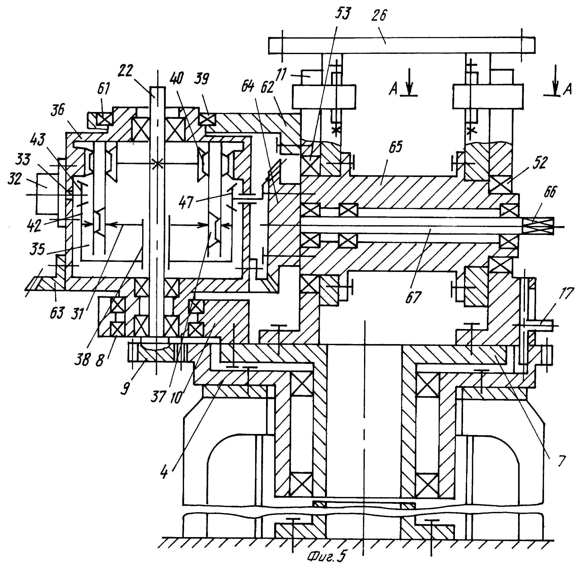 - пара конических колес 47, 42, генератор волн 31, зубчатое колесо 35, соединенное с корпусом 36 волновой