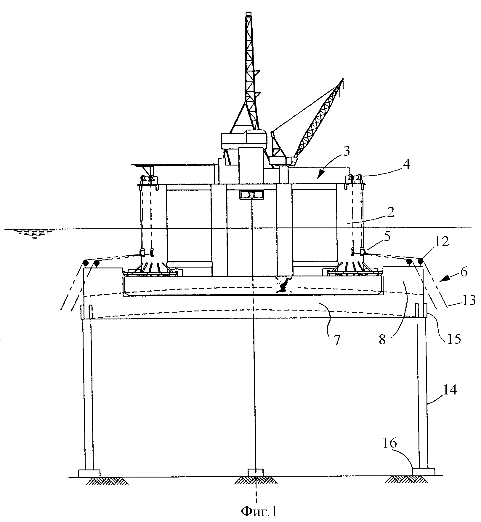 действием своей собственной плавучести способом платформы с опорами натяжения. В этом случае привязи 14 (показанные сплошными линиями) идут вниз от устройств 15 натяжения, установленных сзади кессонов